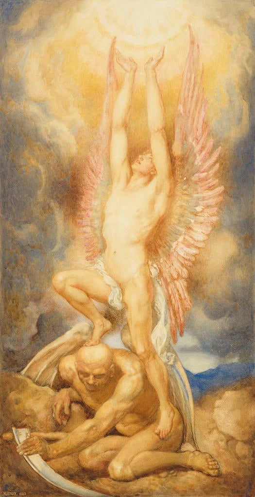 Henry John Stock, britischer Maler des 19. Jahrhunderts, ist bekannt für seine Werke voller Romantik und Spiritualität. Beeinflusst von den Präraffaeliten, widmete er sich der Darstellung mystischer und religiöser Themen und suchte, die Essenz der menschlichen Seele einzufangen. Sein Schaffen fällt in eine Zeit, in der Kunst darauf abzielte, tiefe Emotionen hervorzurufen und transzendente Themen zu erforschen. Obwohl er weniger bekannt ist als einige seiner Zeitgenossen, hat Stock einen bleibenden Eindruck in der Kunstwelt hinterlassen, dank seiner Fähigkeit, ästhetische Schönheit mit kraftvollen spirituellen Botschaften zu verbinden.