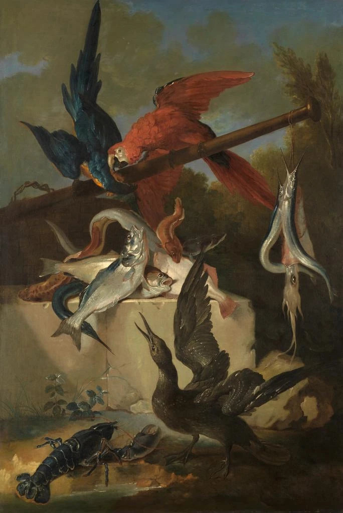 In diesem faszinierenden Werk entfaltet Jean-Baptiste Oudry eine lebendige Palette, in der schimmernde Fische, anmutige Meeresvögel und leuchtende Papageien sich in einer harmonischen Komposition verweben. Jedes Detail ist sorgfältig wiedergegeben und zeigt die Meisterschaft des Künstlers im Umgang mit Licht und Schatten. Die leuchtenden Farben, die von tiefem Blau bis zu üppigem Grün reichen, schaffen eine lebendige und dynamische Atmosphäre und laden den Betrachter ein, in eine Welt einzutauchen, in der die Natur erblüht. Oudrys Technik, die Realismus und Empfindsamkeit verbindet, erweckt diese Kreaturen zum Leben und verwandelt sie in Akteure einer fast theatralischen Szene.