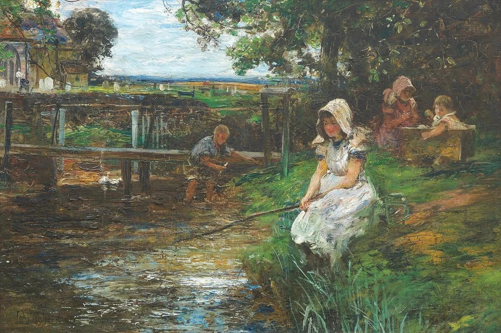 John Robertson Reid, schottischer Maler des 19. Jahrhunderts, ist bekannt für seine Werke, die das tägliche Leben und die britischen Landschaften einfangen. In einer Zeit, die vom Impressionismus geprägt war, verstand Reid, Elemente dieses Stils in seine eigenen Kreationen zu integrieren, wobei er eine realistische Note bewahrte. Seine Gemälde, oft bevölkert von Figuren in Bewegung, zeugen von einer besonderen Sensibilität für Szenen des ländlichen Lebens. "Pêche aux têtards" veranschaulicht perfekt seine Fähigkeit, Lebensfreude und kindliche Unschuld darzustellen, während es gleichzeitig die Schönheit der umgebenden Natur hervorhebt.