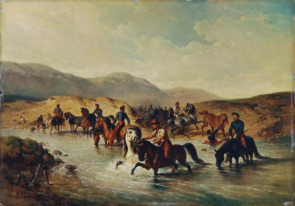 Französische Kavallerie im Pferdeschwemme: ein lebendiges Lebensbild.