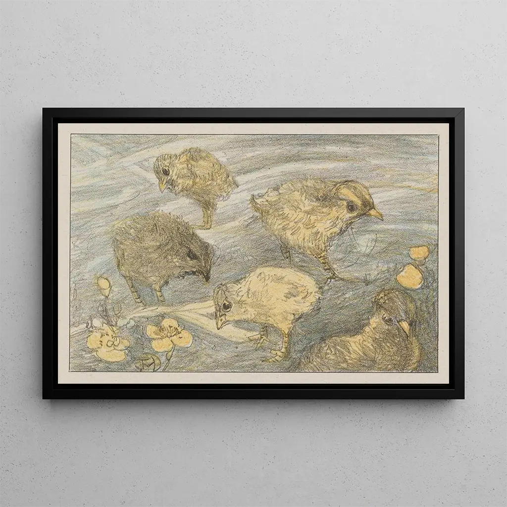 Fünf Küken : eine zarte Vogelkunst zum Entdecken In diesem zarten Werk fängt Theo van Hoytema die Unschuld und Neugier der jungen Küken ein. Die Komposition, subtil ausbalanciert, hebt die kleinen Kreaturen mit flauschigem Gefieder hervor, die in einem sanften und warmen Licht baden. Die Pastelltöne, die von blassem Gelb bis Beige reichen, schaffen eine beruhigende, fast traumhafte Atmosphäre. Die Aquarelltechnik, mit Feinfühligkeit angewandt, ermöglicht es, die zarten Texturen der Federn und des Bodens darzustellen, während sie diesen kleinen Wesen lebendige Vitalität verleiht. Dieser kunstdruck von "Fünf Küken" lädt zu einer ruhigen Betrachtung ein und evoziert die schlichte Schönheit der Natur. Theo van Hoytema : ein Pionier der Tierkunst Theo van Hoytema, 1863 in den Niederlanden geboren, ist bekannt für seinen einzigartigen Ansatz in der Tierkunst, der Realismus und Impressionismus verbindet. Beeinflusst von den großen Meistern seiner Zeit, entwickelt er einen Stil, der die Schönheit der Tiere in ihrer natürlichen Umgebung hervorhebt. Hauptsächlich aktiv gegen Ende des 19. und Anfang des 20. Jahrhunderts, zeichnet er sich durch seine Fähigkeit aus, das Wesen der Motive, die er malt, einzufangen. Sein Werk befindet sich an der Schnittstelle zwischen traditioneller Kunst und neuen künstlerischen Strömungen, was ihn zu einer bedeutenden Figur in der niederländischen Kunstlandschaft macht. Eine dekorative Anschaffung mit vielfältigen Vorzügen Der kunstdruck von "Fünf Küken" von Theo van Hoytema ist eine ideale dekorative Wahl für verschiedene Wohnräume. Ob im Wohnzimmer, im Kinderzimmer oder sogar im Büro, dieses Bild bringt eine Note von Sanftheit und Gelassenheit. Seine Druckqualität garantiert eine Treue zu den Farben und Details des Originalwerks, während es gleichzeitig eine unbestreitbare ästhetische Anziehungskraft bietet. Durch die Integration dieses kunstdrucks in Ihre Dekoration laden Sie nicht nur die Natur in Ihr Zuhause ein, sondern schaffen auch einen Blickfang, der Neugier und Staunen weckt.