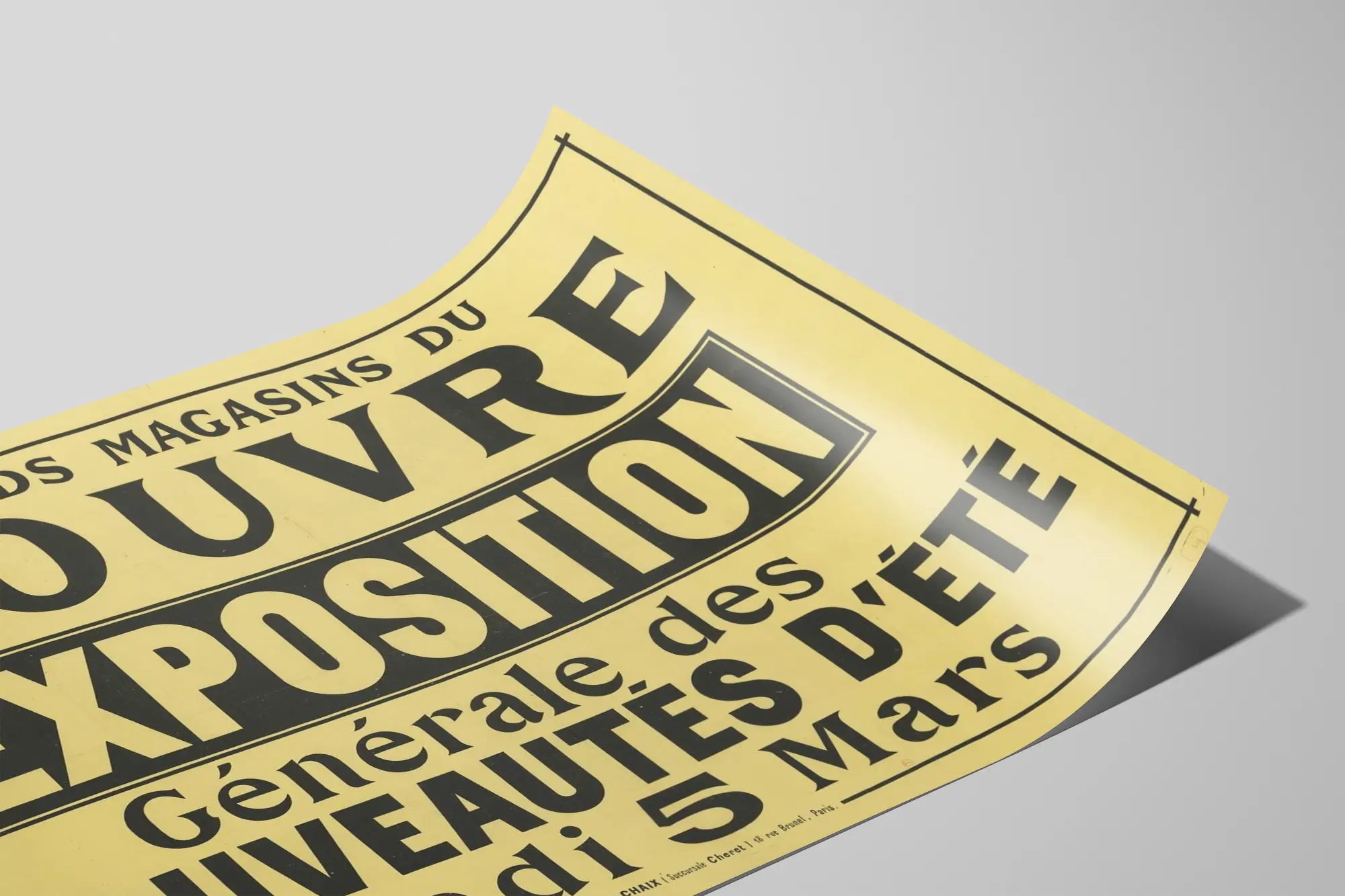 Cette affiche vintage des Grands Magasins du Louvre est une pièce emblématique de décoration murale. Avec son design graphique en noir sur fond jaune, elle annonce une exposition générale présentant les nouveautés d'été, programmée pour un lundi 5 mars. Ce poster publicitaire, au style ancien, rappelle l'élégance des campagnes de communication des grands magasins parisiens d'autrefois. Idéale pour habiller un mur avec une touche rétro et authentique, cette affiche s'inscrit parfaitement dans un univers de décoration vintage ou industrielle. Son grand format et sa typographie en lettres majuscules apportent un impact visuel fort, pour ceux qui souhaitent une décoration murale originale avec une histoire. Ce tableau publicitaire invite à redécouvrir un aspect historique commercial parisien, tout en étant un élément décoratif moderne. Que ce soit dans un salon, un bureau ou une boutique, ce poster se démarque par son style typographique simple mais efficace, et sa mise en page claire et équilibrée. Un choix parfait pour les amateurs d'art graphique et de décoration murale unique qui veulent insuffler un charme d'époque à leur intérieur.