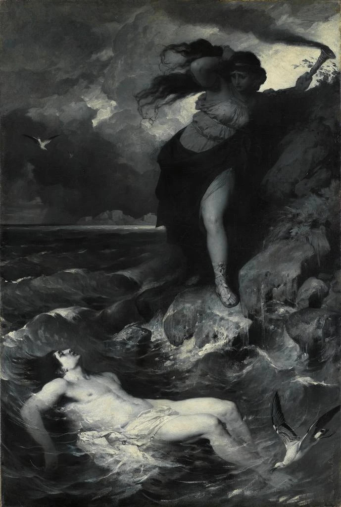 In diesem berührenden Werk entführt uns Ferdinand Keller in das Herz einer mythologischen Legende. Das Gemälde "Héro und Léandre" zeigt mit bemerkenswerter Feinfühligkeit die beiden Liebenden, die durch die stürmischen Fluten getrennt sind. Die lebendigen Farben und die zarten Nuancen schaffen eine Atmosphäre, die sowohl romantisch als auch tragisch ist, während die Technik des Künstlers, die Realismus und Impressionismus verbindet, den Emotionen der Figuren Leben einhaucht. Die detaillierten Wellen und die dramatischen Himmel verleihen dieser ikonischen Szene eine zusätzliche Dimension und laden den Betrachter ein, die Leidenschaft und Verzweiflung zu spüren, die von dieser Liebesgeschichte ausgehen.