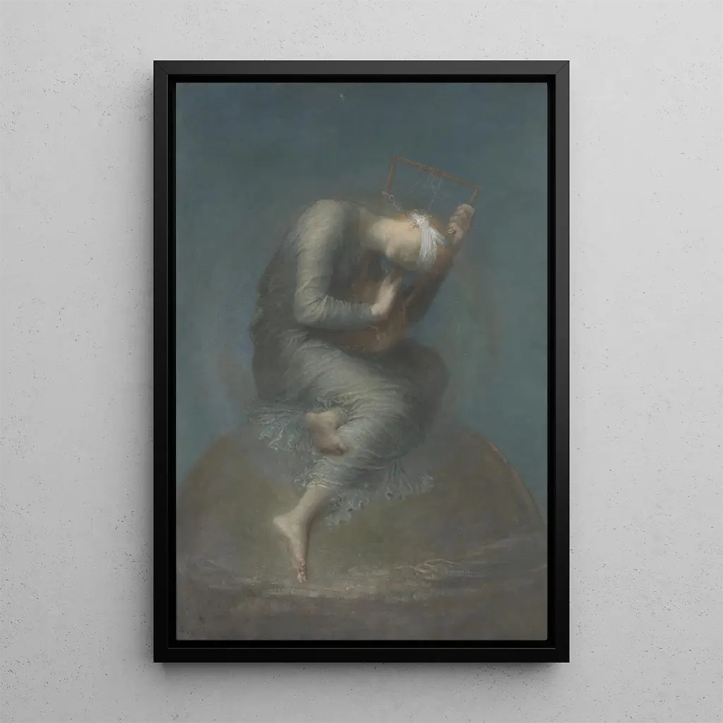 In der Leinwand "Espoir" fängt George Frederic Watts das Wesen der menschlichen Sehnsucht ein. Dieses Werk, geprägt vom Symbolismus, zeigt eine zarte weibliche Figur, die die Augen geschlossen hält, eine Lyra haltend, ein Symbol für Musik und Harmonie. Die sanften Farben und Pastelltöne schaffen eine ruhige, fast ätherische Atmosphäre, während der dunkle Hintergrund die Helligkeit der Protagonistin betont. Watts' Technik, die Ölmalerei mit detaillierten Feinheiten verbindet, lädt den Betrachter zu einer introspektiven Betrachtung ein und offenbart die Kämpfe und Hoffnungen, die in jedem von uns wohnen.