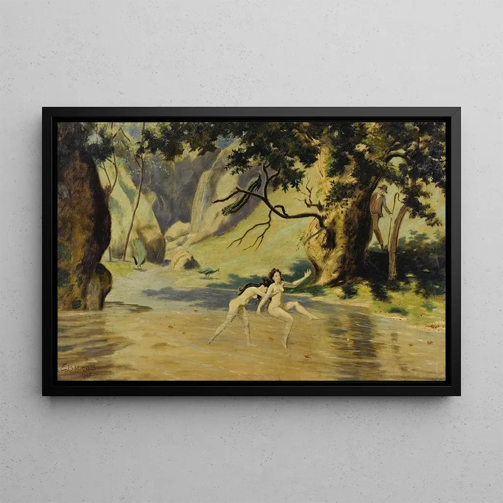 Der Intrus: Eine Erforschung der menschlichen Emotionen Der Kunstdruck "Der Intrus" von Louis Michel Eilshemius zeichnet sich durch seine faszinierende Komposition und seine zarten Farben aus. Dieses Gemälde, zugleich geheimnisvoll und ausdrucksstark, taucht den Betrachter in eine Welt ein, in der die menschlichen Emotionen im Vordergrund stehen. Die Pastelltöne, kombiniert mit dunkleren Akzenten, schaffen eine Atmosphäre, die sowohl träumerisch als auch melancholisch ist. Die Technik des Künstlers, die Impressionismus und Symbolismus verbindet, ermöglicht eine tiefe Verbindung zu den dargestellten Figuren. Jedes Detail, jeder Pinselstrich erzählt eine Geschichte und lädt zu einer längeren Betrachtung ein. Louis Michel Eilshemius: Ein Pionier der modernen Kunst Louis Michel Eilshemius, aktiv gegen Ende des 19. und Anfang des 20. Jahrhunderts, gilt oft als Vorläufer der modernen Kunst. Beeinflusst von den großen Meistern seiner Zeit, entwickelt er einen einzigartigen Stil, der Elemente des Impressionismus mit introspektiveren Themen verbindet. Obwohl weniger bekannt als seine Zeitgenossen, konnte Eilshemius Momente des Alltagslebens mit einer seltenen Sensibilität einfangen. Sein Werk, häufig geprägt von einer gewissen Einsamkeit, spiegelt die Sorgen einer sich im Wandel befindlichen Epoche wider, in der künstlerische Konventionen hinterfragt wurden. "Der Intrus" ist Teil dieser Suche nach Authentizität und Emotion. Eine dekorative Anschaffung mit vielfältigen Vorzügen Der Kunstdruck von "Der Intrus" ist ein ideales Dekorationsstück, um Ihr Zuhause zu bereichern, sei es im Wohnzimmer, im Büro oder im Schlafzimmer. Die Druckqualität garantiert eine bemerkenswerte Farbtreue und Detailgenauigkeit des Originalwerks, sodass Sie die einzigartige Atmosphäre, die es ausstrahlt, voll genießen können. Dieses Gemälde, mit seinem unbestreitbaren ästhetischen Reiz, wird Gespräche anregen und die Neugier Ihrer Gäste wecken. Durch die Integration dieses Kunstdrucks in Ihren Raum verleihen Sie Ihrem Zuhause eine elegante und tiefgründige Note und feiern gleichzeitig das künstlerische Erbe von Louis Michel Eilshemius.