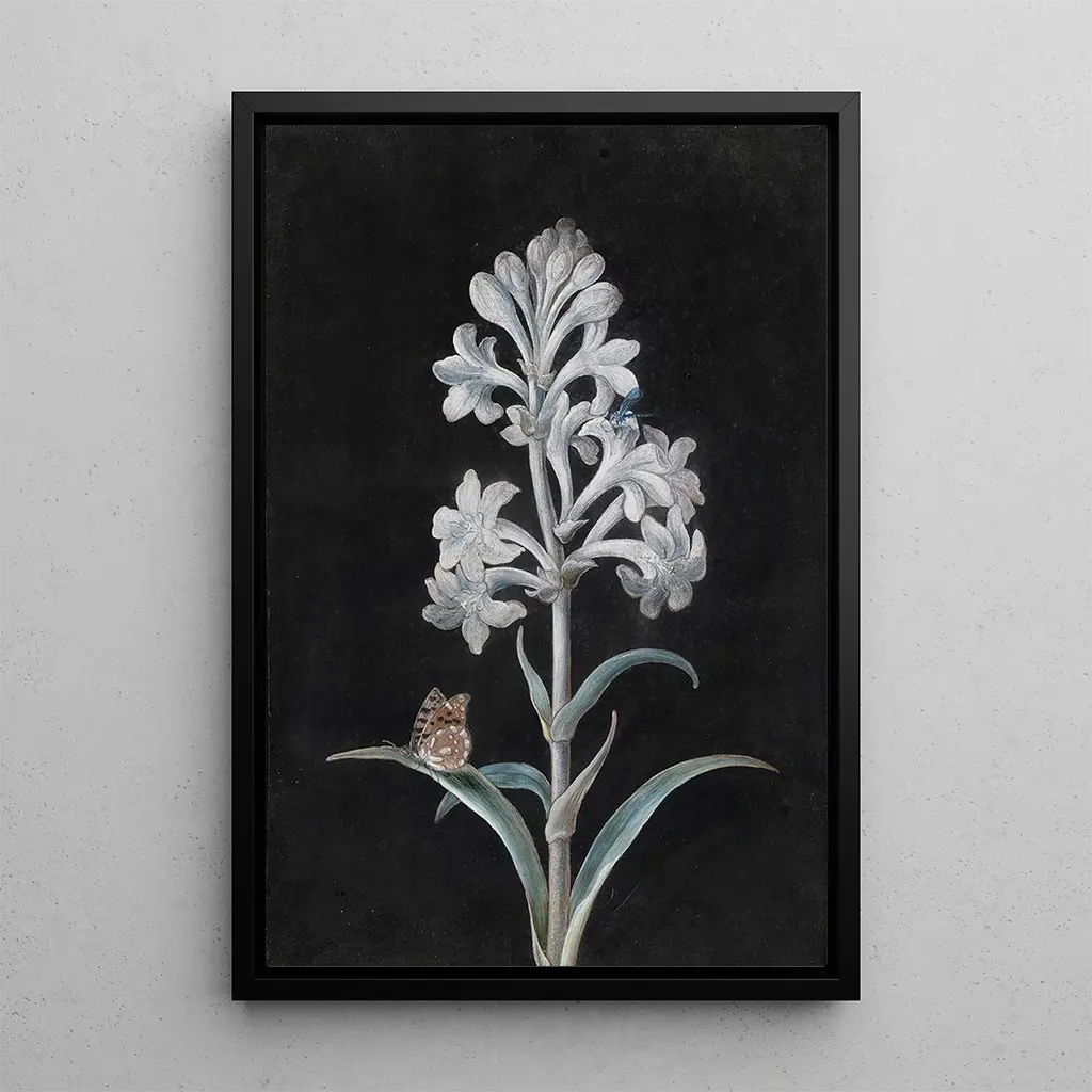 Die kunstdruck der Jacinthe blanche von Margaretha Barbara Dietzsch entführt uns in eine Welt der Sanftheit und Raffinesse. Dieses Werk, mit einer subtilen Ölmaltechnik ausgeführt, hebt strahlend weiße Töne hervor, die durch Akzente in Grün und Blau ergänzt werden. Die minutösen Details der Blütenblätter und Blätter schaffen eine beruhigende, fast meditative Atmosphäre. Die Komposition, die sich auf die Blume konzentriert, zieht sofort den Blick auf sich und lädt zur Betrachtung der vergänglichen Schönheit der Natur ein. Jeder Pinselstrich scheint das Licht einzufangen, was diese Leinwand zu einem wahren Tribut an die Zartheit der Blumen macht.