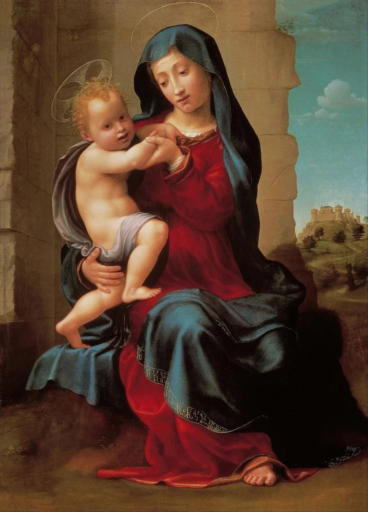 Die Vierge an Kind von Giuliano Bugiardini ist ein Werk, das die Sanftheit und Gelassenheit ausstrahlt. In dieser Darstellung sind die Mutter und das Kind von einem sanften Licht umhüllt, das die Feinheit der Züge betont. Die Pastellfarben, die Nuancen von Blau und Rosa mischen, schaffen eine beruhigende Atmosphäre. Die Ölmaltechnik ermöglicht es, die Texturen der Kleidung und die Haut mit bemerkenswerter Feinheit wiederzugeben. Jedes Detail, vom schelmischen Blick zwischen der Vierge und dem Kind bis hin zur Art, wie die Drapierungen fallen, lädt den Betrachter zu einer tiefen und emotionalen Betrachtung ein.