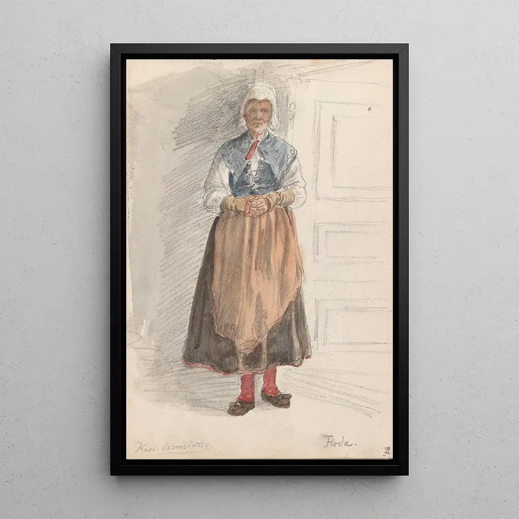 In dieser kunstdruckversion von Kari Saorisdatter Floda fängt Adolph Tidemand das Wesen der norwegischen Natur ein. Die Komposition wird von sanften Grüntönen und Blautönen dominiert, die die majestätischen Landschaften der Fjorde hervorrufen. Die detaillierten Details der traditionellen Kleidung der Figuren verleihen dieser idyllischen Szene eine menschliche Dimension. Die Atmosphäre ist von Gelassenheit geprägt und lädt den Betrachter ein, in einen Moment der Ruhe und Kontemplation einzutauchen. Tidemand gelingt es, eine tiefe Verbindung zwischen Mensch und Umwelt zu vermitteln, wodurch dieses Werk sowohl poetisch als auch emotional wirkt.