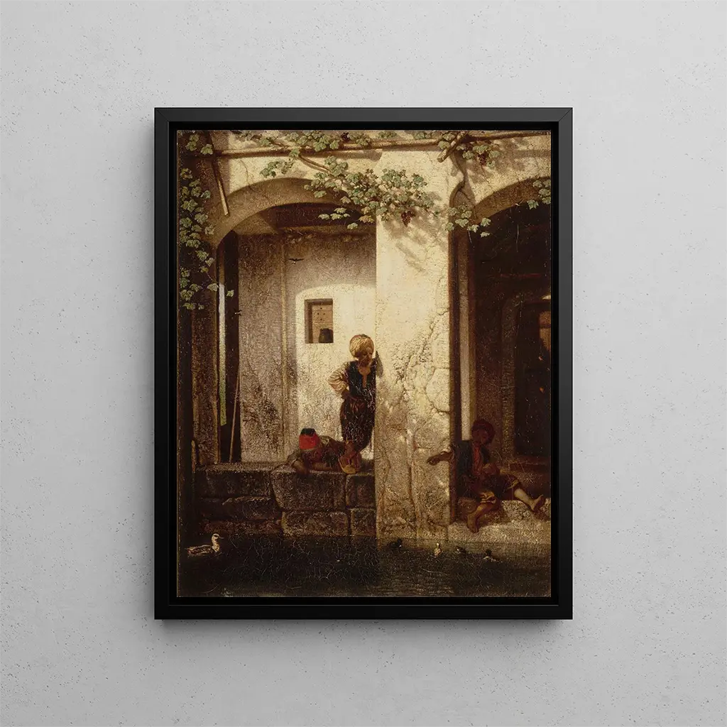 Reproduktion Kinder türkischer Herkunft an einem Brunnen - Alexandre-Gabriel Decamps – Faszinierende Einführung Das Werk "Kinder türkischer Herkunft an einem Brunnen" von Alexandre-Gabriel Decamps entführt den Betrachter in eine farbenfrohe und emotionale Welt. Gemalt im 19. Jahrhundert, zeigt diese lebendige Szene türkische Kinder, die in der Nähe eines Brunnens spielen, und fängt so die Unbeschwertheit der Kindheit in einem bezaubernden orientalischen Rahmen ein. Das Licht, das die Leinwand durchflutet, die detaillierten Kostüme und die Gesichtsausdrücke der Kinder laden zu einer längeren Betrachtung ein. Dieses Werk, ein emblematischer Vertreter des orientalistischen Stils, evoziert nicht nur einen flüchtigen Moment der Freude, sondern auch einen Dialog zwischen Kulturen, in dem der Westen vom Orient begeistert ist. Stil und Einzigartigkeit des Werks Der Stil von Decamps zeichnet sich durch eine mutige Verwendung von Licht und Farben aus, die eine lebendige und dynamische Atmosphäre schafft. In "Kinder türkischer Herkunft an einem Brunnen" verschmelzen die warmen, leuchtenden Töne harmonisch, während die zarten Schatten eine beeindruckende Tiefe in die Komposition bringen. Die Kinder, in natürlichen Posen eingefroren, scheinen unter dem Pinselstrich des Künstlers fast zum Leben zu erwachen. Der Brunnen, zentrales Element der Szene, ist nicht nur ein Accessoire, sondern ein Symbol für Leben und Frische und verstärkt die Idee eines Spiel- und Glücksortes. Dieses Werk, sowohl realistisch als auch poetisch, veranschaulicht perfekt Decamps' Fähigkeit, malerische Technik und künstlerische Sensibilität zu verbinden. Der Künstler und sein Einfluss Alexandre-Gabriel Decamps, eine bedeutende Figur der orientalistischen Bewegung, hat die Essenz der Kulturen, die er auf seinen Reisen erkundet hat, eingefangen. Beeinflusst von Künstlern wie Eugène Delacroix und Théodore Chassériau, entwickelte Decamps einen einzigartigen Stil, der Detailgenauigkeit und Ausdruckskraft vereint. Seine Faszination für den Orient, den er auf seinen Reisen entdeckte, spiegelt sich in seinen Werken wider, in denen er Szenen des Alltags, Landschaften und Figuren mit großer Authentizität darstellt. Sein Ansatz hat nicht nur das künstlerische Panorama seiner Zeit bereichert, sondern auch den Weg für andere Künstler geebnet, die ähnliche Themen erkunden wollten.