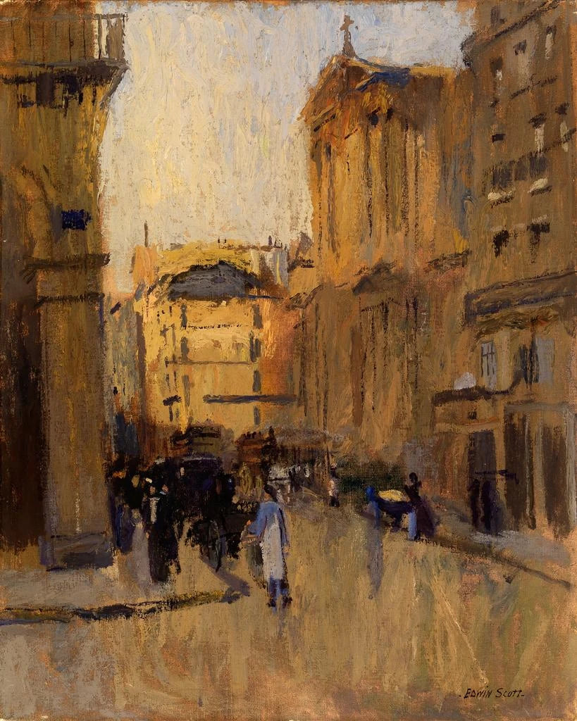 Reproduktion Église Saint-Roch - Frank Edwin Scott – Einführung fesselnd Im faszinierenden Panorama der Kunstgeschichte übersteigen einige Werke den bloßen Bildrahmen, um uns in eine Atmosphäre voller Emotionen und Geschichten einzutauchen. Die Reproduktion Église Saint-Roch - Frank Edwin Scott ist ein perfektes Beispiel dafür. Dieses Gemälde, geprägt von Gelassenheit und Geheimnis, lädt uns ein, nicht nur das Bauwerk, das es darstellt, zu entdecken, sondern auch die Seele eines Künstlers, der die Essenz eines heiligen Ortes einzufangen wusste. Wenn wir in dieses Werk eintauchen, stehen wir vor einem Dialog zwischen Vergangenheit und Gegenwart, eine Einladung, die zeitlose Schönheit von Architektur und Licht zu bewundern. Stil und Einzigartigkeit des Werks Frank Edwin Scott entfaltet in diesem Werk einen Stil, der ihm eigen ist, eine Verbindung aus Realismus und Impressionismus. Das Licht spielt eine zentrale Rolle und erleuchtet das Innere der Kirche mit einer fast greifbaren Sanftheit. Die Spiel von Schatten und Licht schafft eine mystische Atmosphäre, in der jeder Strahl eine Geschichte zu erzählen scheint. Die architektonischen Details der Église Saint-Roch sind sorgfältig wiedergegeben, was auf eine genaue Beobachtung und tiefen Respekt für das kulturelle Erbe hinweist. Die Farben, sowohl lebendig als auch zart, spiegeln die Spiritualität des Ortes wider und offenbaren gleichzeitig die technische Meisterschaft des Künstlers. Dieses Gemälde beschränkt sich nicht nur auf die Darstellung eines Bauwerks; es offenbart dessen Seele und lädt den Betrachter ein, den Frieden zu spüren, der von diesem heiligen Raum ausgeht. Der Künstler und sein Einfluss Frank Edwin Scott, eine ikonische Figur des frühen 20. Jahrhunderts, hat sich in der Kunstwelt durch seine einzigartige Vision durchgesetzt. Seine Fähigkeit, Licht und Architektur zu verbinden, hat zahlreiche zeitgenössische Künstler beeinflusst, die in ihm einen Vorreiter eines neuen malerischen Ansatzes sahen. Scott wurde von den großen Meistern der Vergangenheit inspiriert, doch er suchte auch, moderne Themen zu erforschen, insbesondere die Beziehung zwischen Mensch und Umwelt. Sein Werk ist ein Zeugnis seiner Zeit, aber auch eine Reflexion über ewige Fragen. Durch seine Gemälde lädt er uns ein, oft vergessene Orte neu zu entdecken, über das Äußere hinauszublicken und die Tiefe der Emotionen zu spüren, die sie hervorrufen. Sein Erbe