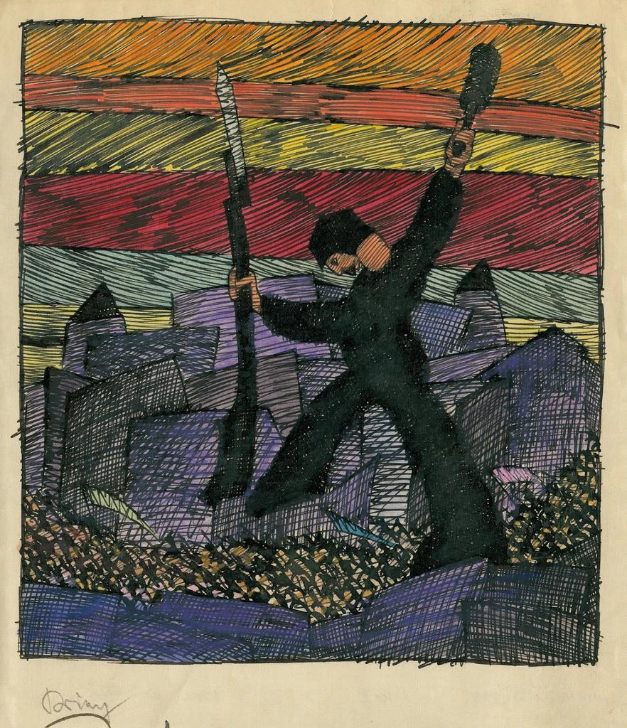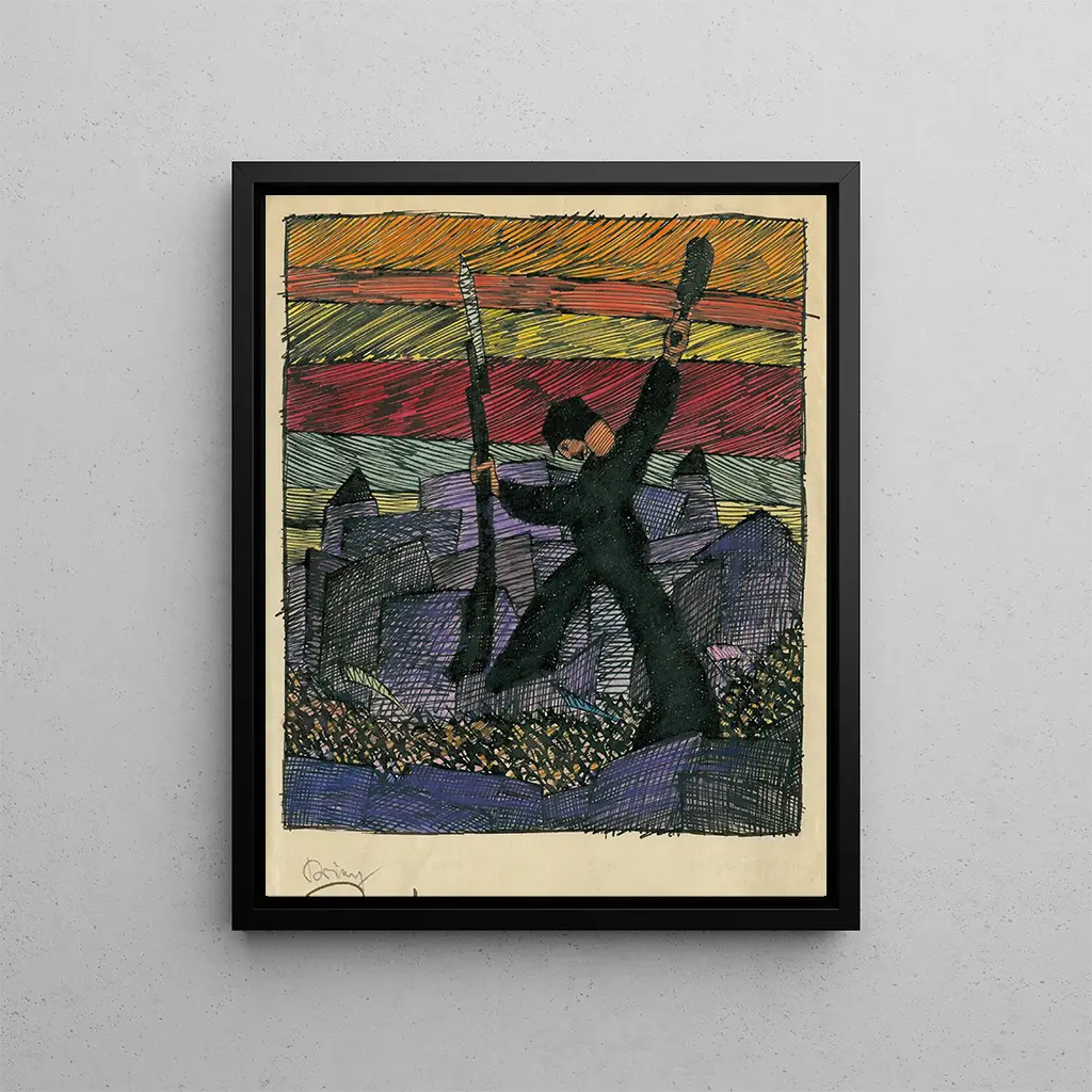 Dieses beeindruckende Gemälde von {{artist}} zeigt eine dramatische Szene, die die Kraft und Intensität des Krieges einfängt. Mit lebendigen Farben und meisterhafter Technik bringt es die Emotionen und das Chaos des Konflikts zum Ausdruck.