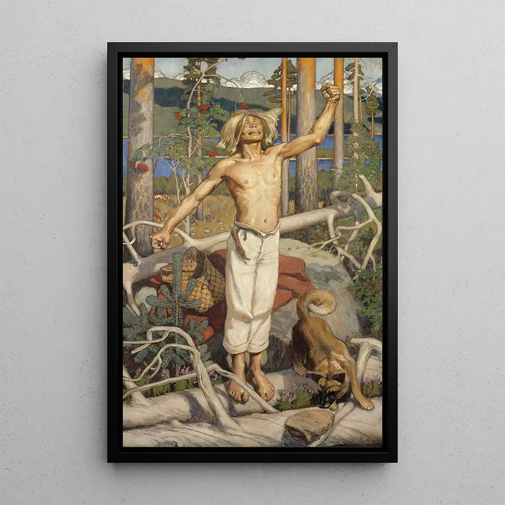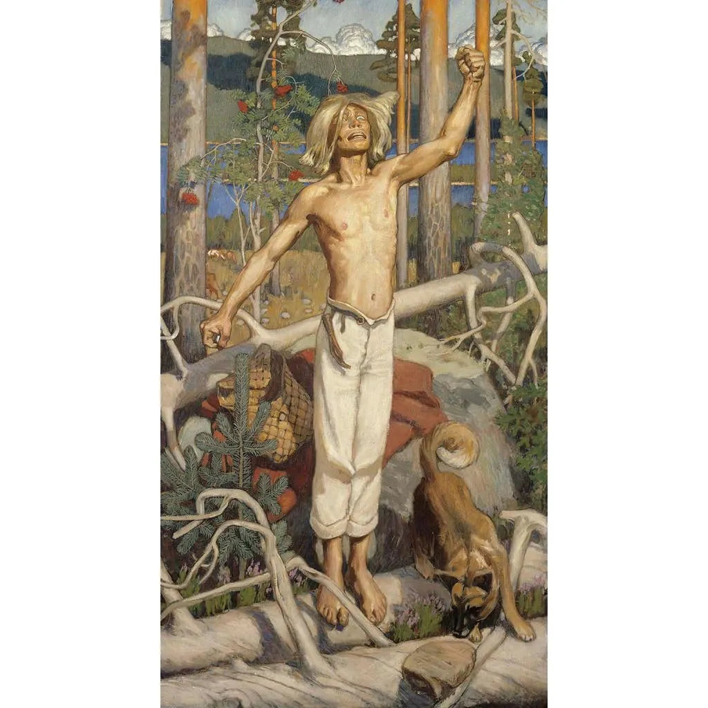 Kullervo verfluchend: Ein kunstdruck voller Tragödie und Leidenschaft Kullervo verfluchend, ikonischer kunstdruck von Akseli Gallen-Kallela, taucht den Betrachter in eine Welt der Verzweiflung und inneren Kämpfe. Die dynamische komposition, bei der die zentrale figur mit Intensität emporragt, wird durch dunkle farben und rote akzente betont, die Zorn und Schmerz symbolisieren. Die technik von Gallen-Kallela, die Realismus und Symbolismus verbindet, schafft eine berührende atmosphäre, in der jedes detail eine geschichte erzählt. Dieser kunstdruck, inspiriert von der finnischen mythologie, ruft universelle themen wie Rache und Schicksal hervor und lädt zu einer tiefgründigen reflexion über die menschliche bedingung ein. Akseli Gallen-Kallela: ein pionier des finnischen symbolismus Akseli Gallen-Kallela, geboren 1865, zählt zu den einflussreichsten künstlern Finnlands und ist bekannt für seine rolle in der entwicklung des nordischen symbolismus. Seine karriere, geprägt von reisen nach Frankreich und Italien, ermöglichte es ihm, verschiedene künstlerische einflüsse zu integrieren, während er fest in seinen finnischen wurzeln verwurzelt blieb. Gallen-Kallela lässt sich von nationalen epischen werken wie dem Kalevala inspirieren und nutzt seine kunst, um folkloristische und mythologische themen zu erforschen. Sein werk, Kullervo verfluchend, ist ein perfektes beispiel für seine fähigkeit, geschichte und legende zu verschmelzen, während er intensive emotionen durch mutige formen und farben vermittelt. Eine dekorative anschaffung mit vielfältigen vorteilen Der kunstdruck von Kullervo verfluchend ist ein zentrales stück, das eine note von emotion und tiefe in ihr zuhause bringt. Ob im wohnzimmer, büro oder schlafzimmer, dieser fesselnde kunstdruck zieht den blick auf sich und weckt neugier. Die qualität des kunstdrucks garantiert eine bemerkenswerte detailtreue an das originale werk, sodass man die kraft der kunst von Gallen-Kallela spüren kann. Mit seinem unbestreitbaren ästhetischen reiz wird dieses leinwandbild nicht nur zu einem dekorativen element, sondern auch zu einer quelle der inspiration und reflexion für alle, die es betrachten.