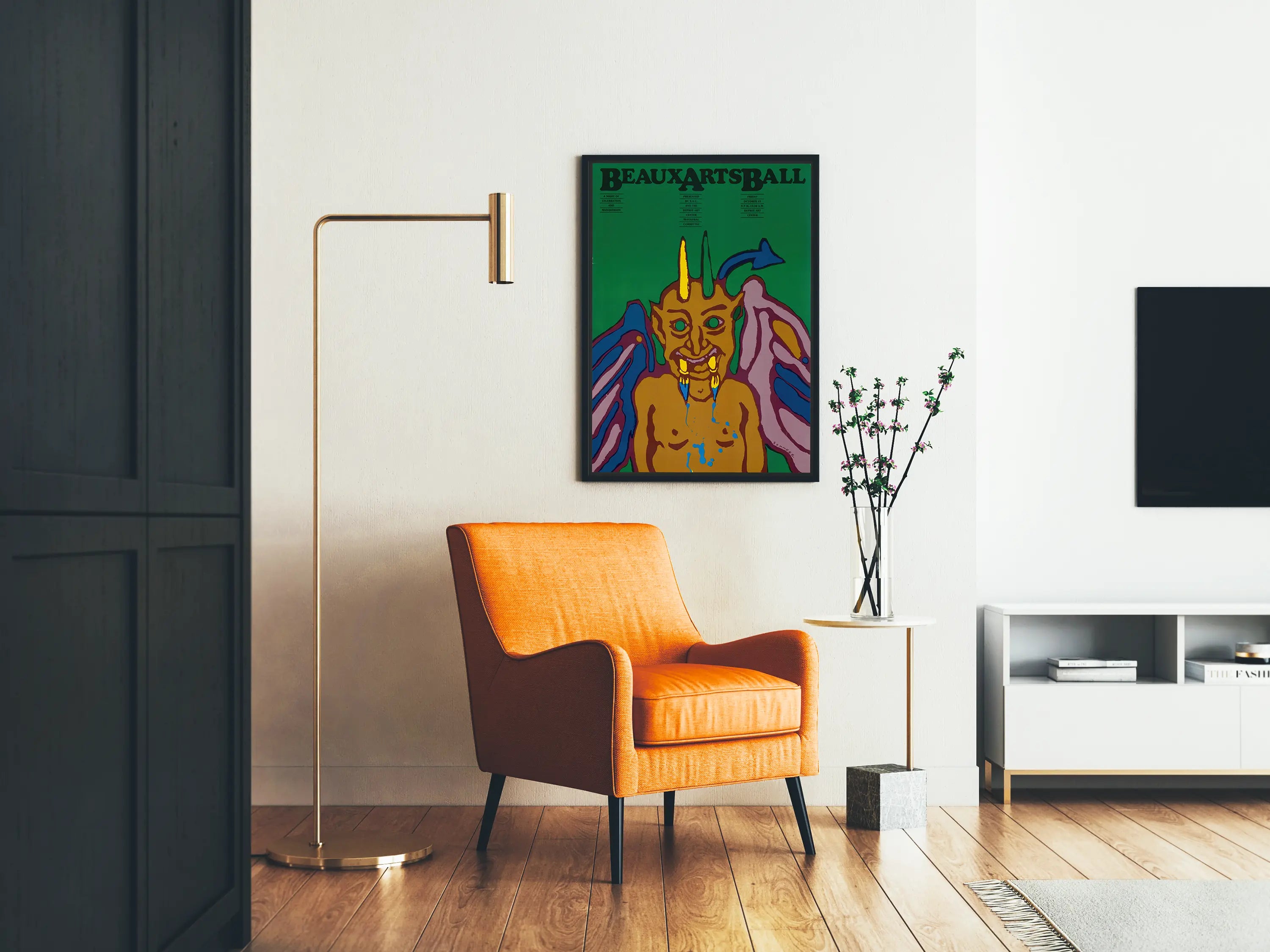 Der im oberen Bereich des Posters gedruckte Text kündigt eine Veranstaltung mit dem Titel „Beaux Arts Ball“ an, was auf einen festlichen, kostümierten Kunstabend hindeutet, verstärkt durch die Aussage „Eine Nacht voller Feier und Maskerade“. Die typografischen Schriftzüge sind in Schwarz, fett und strukturiert gestaltet, was ein Gleichgewicht zwischen Text und Bild schafft und eine klare, harmonische Präsentation ermöglicht.