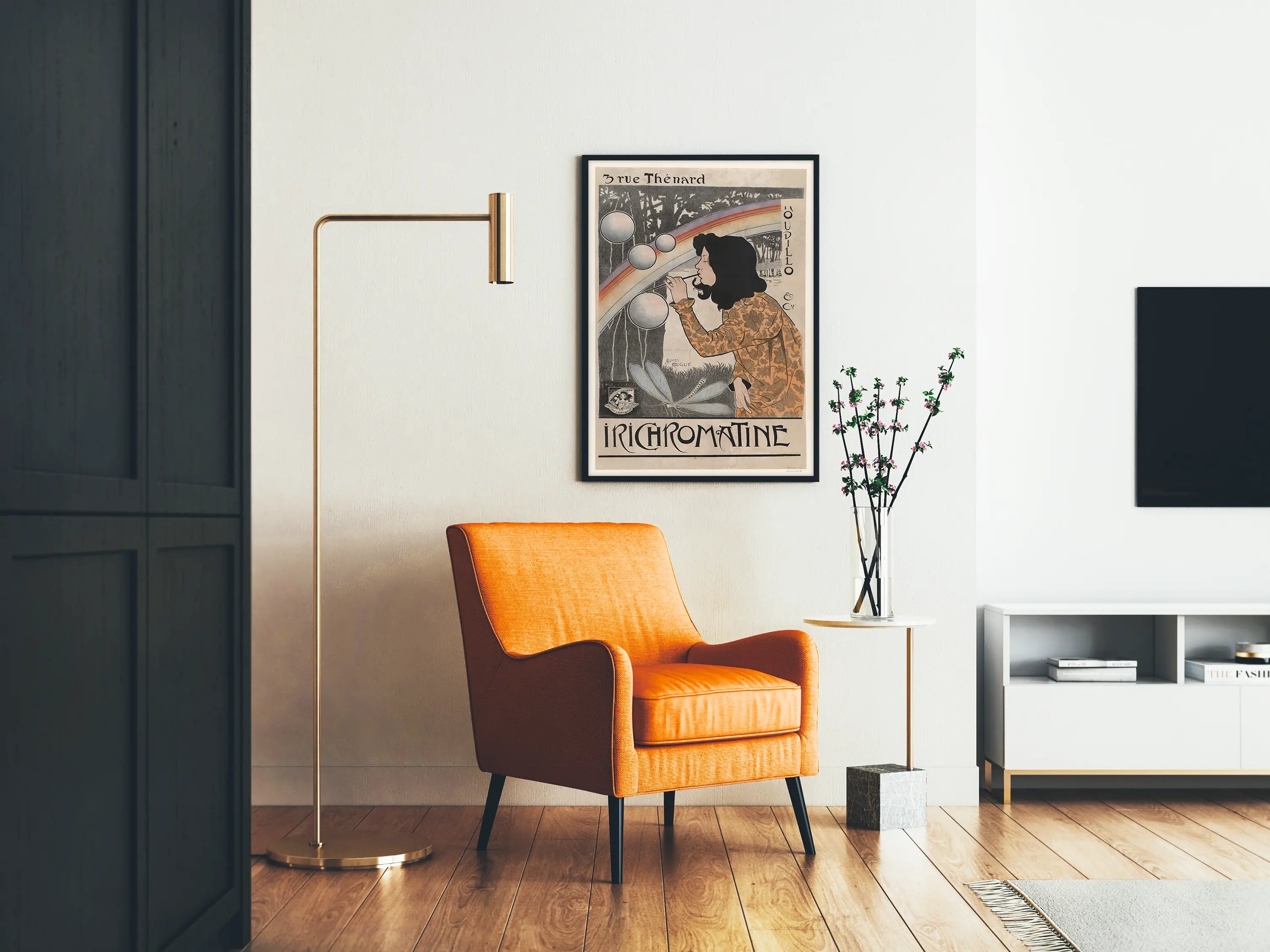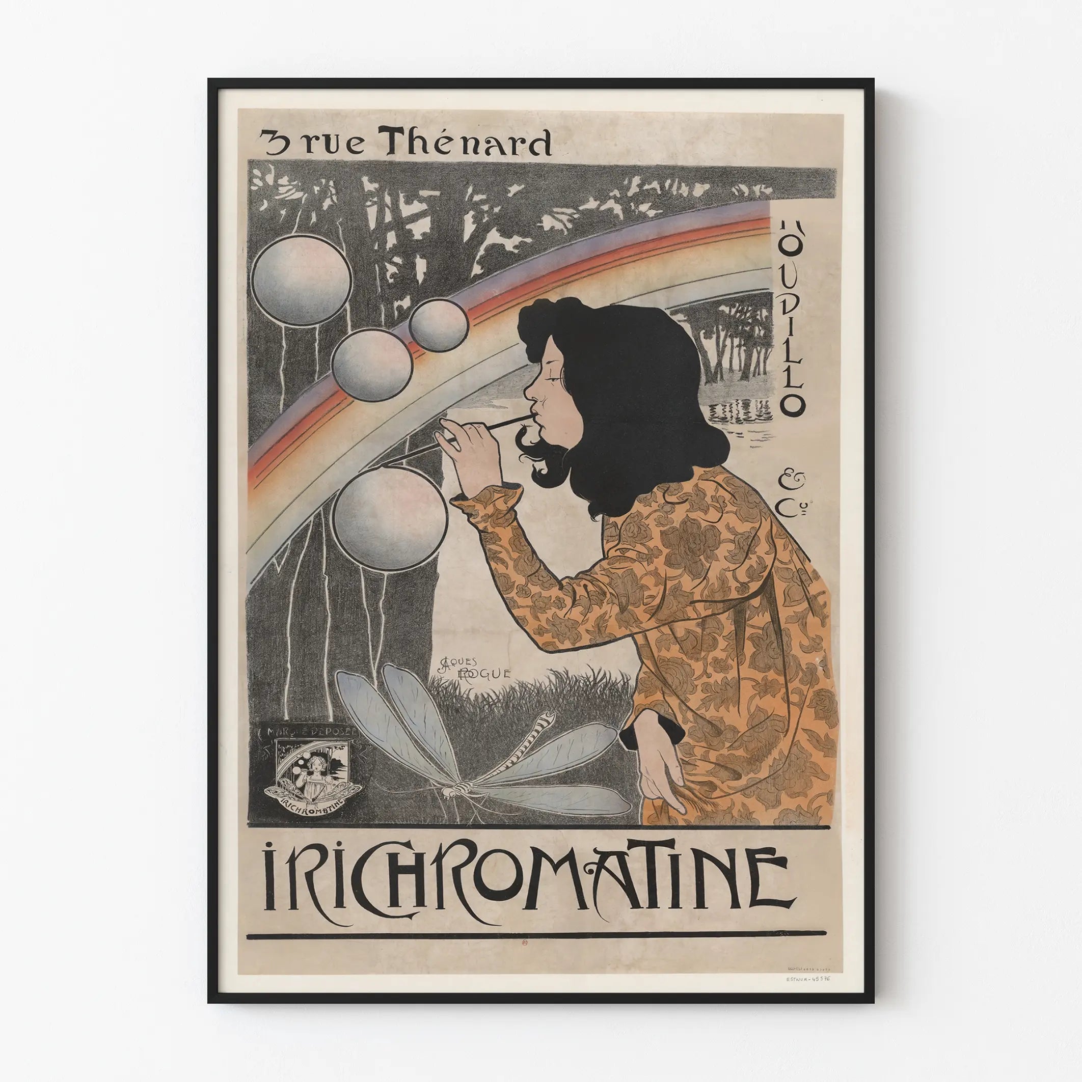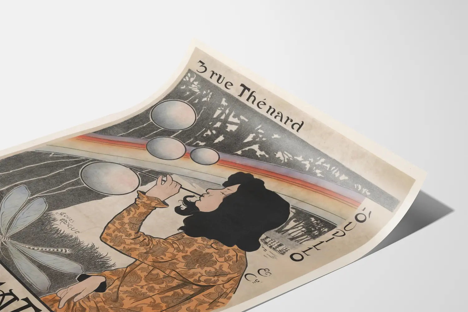 Entdecken Sie dieses markante Jugendstil-Poster mit dem Titel „3 rue Thénard“, das Irichromatin zeigt und vom Künstler Jacques Rogue signiert ist. Dieses dekorative Plakat stellt eine poetische und traumhafte Szene dar, in der eine Frau mit einem Strohhalm sanft Seifenblasen bläst, eingebettet in einen naturalistischen Rahmen, geprägt von einem Regenbogen und stilisierten Bäumen im Hintergrund. Die Komposition, typisch für den Jugendstil, zeichnet sich durch elegante geschwungene Linien und ein feines Spiel zarter Farben aus, insbesondere Ockertöne, Schwarz, Grau und Pastellakzente im Dekor. Die Frau trägt ein Kleid mit komplexen Blumenmustern, die die Raffinesse des Gesamtbildes unterstreichen. Dieses Vintage-Wandbild verleiht jeder Inneneinrichtung einen Hauch von Retro und Kunst, während es den Charme alter Werbeplakate evoziert. Die Aufschrift „3 rue Thénard“ oben im Bild sowie der Name „Oudillo & Cie“ rechts verleihen diesem grafischen Werk eine zusätzliche Authentizität. Diese Wanddekoration ist ideal für Kunst- und Designliebhaber, die ein ausdrucksstarkes und zartes visuelles Element in ihren Raum integrieren möchten. Sie eignet sich zum Anbringen im Wohnzimmer, Büro oder Kulturraum und sorgt für eine elegante und nostalgische Atmosphäre. Nutzen Sie dieses einzigartige Poster, um Ihre Sammlung an Vintage-Wanddekorationen zu bereichern und Ihren Wänden durch dieses markante Werk eine künstlerische Dimension zu verleihen.