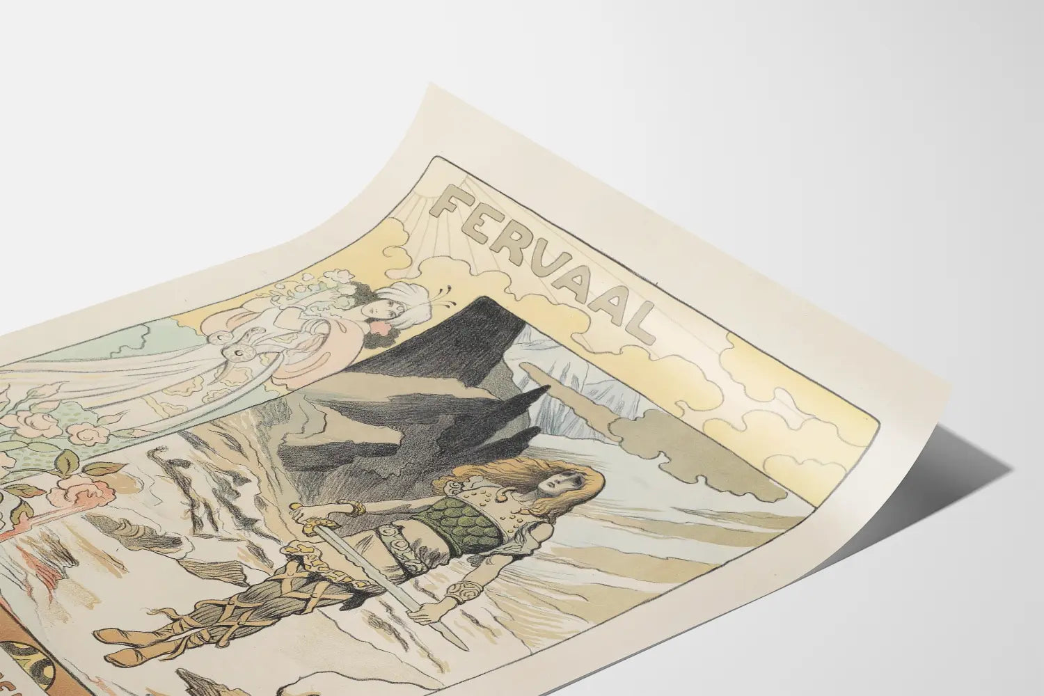 Mit großer Sorgfalt auf Details und in warmen, sanften Farbtönen gestaltet, vermittelt dieses Poster eine Atmosphäre, die sowohl episch als auch poetisch ist, verstärkt durch die bergige Landschaft im Hintergrund. Die Aufschrift „FERVAAL“ am oberen Rand sowie der Name Vincent d'Indy betonen klar das Thema, ohne das Design zu überladen.