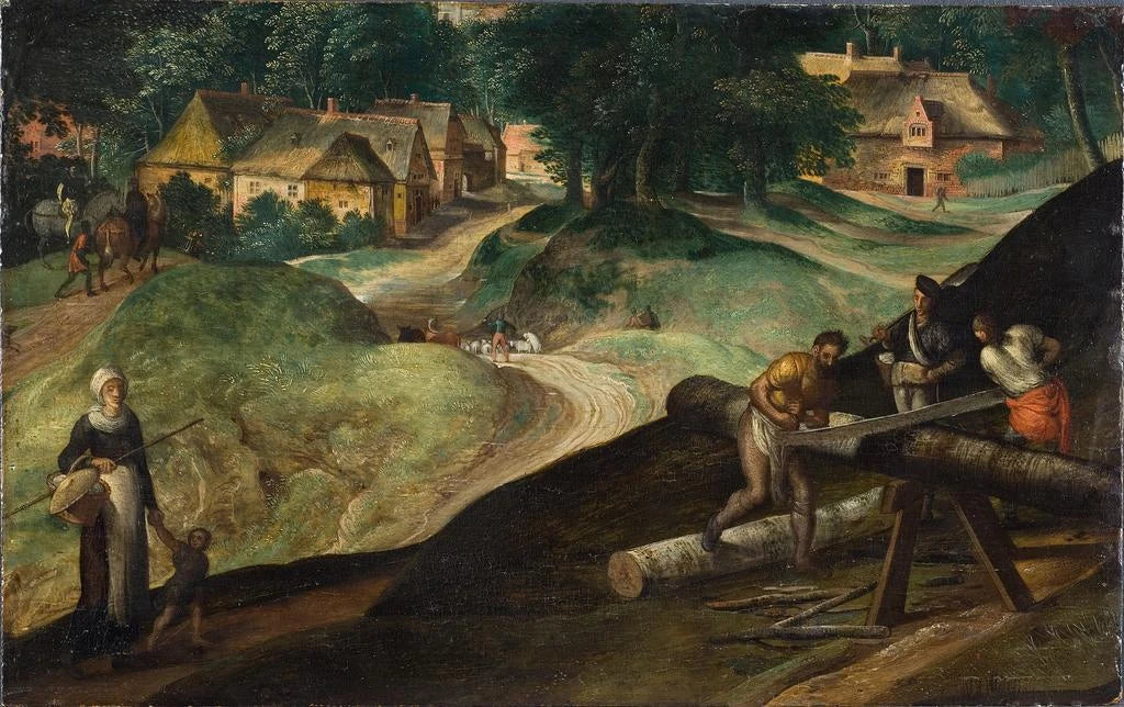 Landschaft mit Männern beim Holzsägen - Gillis Mostaert