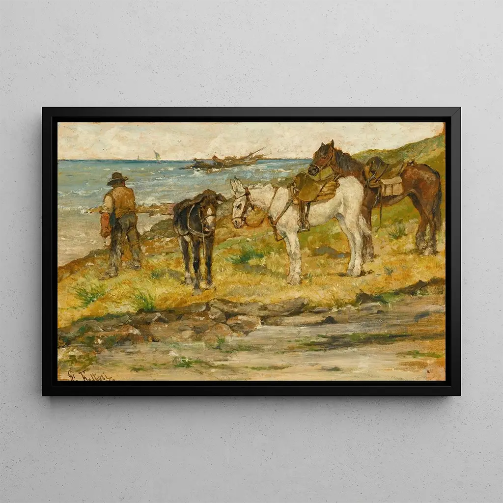 Giovanni Fattori taucht uns ein in ein lebendiges Gemälde voller Leben mit dem kunstdruck Paysage mit Pferden, in dem die majestätischen Tiere unter unseren Augen zu erwachen scheinen. Die warmen, erdigen Farben, vermischt mit Akzenten von Blau und Grün, rufen eine idyllische Szene hervor, in der Natur und Pferde in perfekter Harmonie koexistieren. Die impressionistische Technik von Fattori, gekennzeichnet durch dynamische Pinselstriche, verleiht dem Werk eine Atmosphäre der Bewegung, die fast fühlbar ist. Dieses Bild lädt dazu ein, die Freiheit und die Schönheit des Lebens auf dem Land zu spüren, wobei jedes Detail eine Feier der Natur ist.