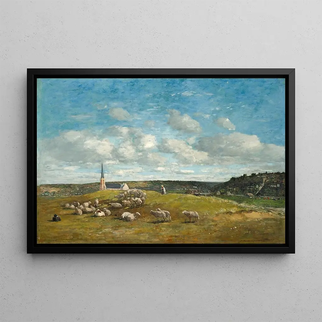 Paysage aux environs de Deauville : eine bucolische Flucht im Freien Das Gemälde "Paysage aux environs de Deauville" von Eugène Boudin vermittelt eine ruhige und helle Atmosphäre. Die Nuancen von Grün und Blau verschmelzen harmonisch und schaffen eine Landschaft, in der Meer und Himmel in einem zarten Tanz aufeinandertreffen. Die impressionistische Technik von Boudin, gekennzeichnet durch schnelle Pinselstriche und leichte Tupfer, erweckt diese Naturszene zum Leben. Das Werk lädt zur Betrachtung ein und versetzt den Betrachter an die normannischen Küsten, wo der frische Wind und das sanfte Rauschen der Wellen fast greifbar erscheinen. Eugène Boudin: der Vorreiter des Impressionismus Eugène Boudin, geboren 1824, gilt oft als einer der Vorreiter des Impressionismus. Beeinflusst von den maritimen Landschaften der normannischen Küste, konnte er das Licht und die Atmosphäre seiner Motive mit bemerkenswerter Feinfühligkeit einfangen. Seine Karriere wurde durch Begegnungen mit Künstlern wie Claude Monet geprägt, die dazu beitrugen, seinen einzigartigen Stil zu formen. Boudin spielte eine entscheidende Rolle in der Entwicklung der Plein-Air-Malerei und ebnete den Weg für eine neue Art, die natürliche Welt zu sehen und darzustellen. Eine dekorative Reproduktion mit vielfältigen Vorzügen Die reproduction des Gemäldes "Paysage aux environs de Deauville" ist eine ideale dekorative Wahl, um Ihrem Interieur eine Note von Gelassenheit zu verleihen. Ob im Wohnzimmer, im Büro oder im Schlafzimmer, diese Leinwand ruft die Schönheit der natürlichen Landschaften hervor und lädt zum Träumen ein. Die Druckqualität garantiert eine Treue zu den Farben und Details des Originalwerks und bietet gleichzeitig eine unbestreitbare ästhetische Anziehungskraft. Durch die Integration dieser reproduction in Ihre Dekoration schaffen Sie einen warmen und inspirierenden Raum, in dem jeder Blick auf das Bild die Magie der normannischen Landschaften wieder aufleben lässt.