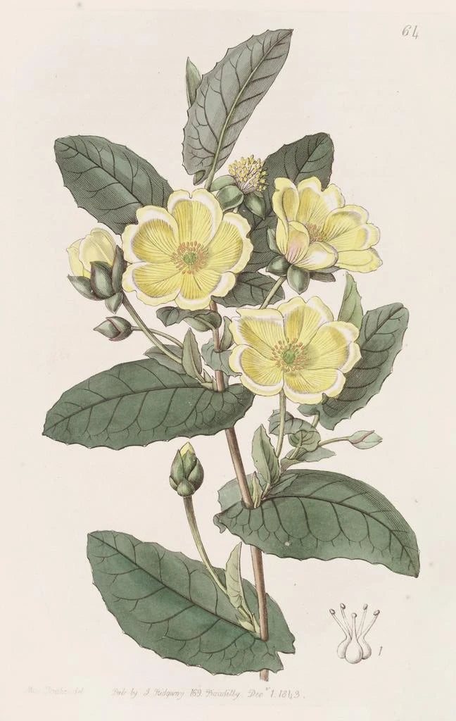 L'hibbertia Thoroughwax, mit ihren leuchtenden Blütenblättern und ihrer zarten Struktur, ist ein Kunstwerk, das die Schönheit der Blumen feiert. Sydenham Edwards gelingt es durch seine Meisterschaft in der Aquarelltechnik, das Licht und die Textur dieser einzigartigen Pflanze einzufangen. Die Nuancen von Gelb und Grün verschmelzen zu einer harmonischen Komposition und laden den Betrachter ein, in eine lebendige Blumenwelt einzutauchen. Jedes Detail ist sorgfältig wiedergegeben und schafft eine Atmosphäre, die sowohl beruhigend als auch inspirierend wirkt – wie ein Spaziergang durch einen üppigen Garten.