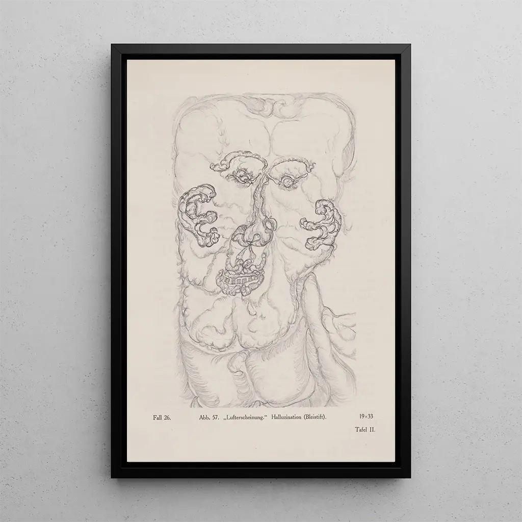 Das Werk "Apparition aérienne Hallucination Crayon" von Hans Prinzhorn lädt zu einer faszinierenden Erkundung des menschlichen Geistes ein. Die lebendigen Farben und abstrakten Formen verschmelzen zu einer Atmosphäre, die zugleich verstörend und fesselnd ist. Die verwendete Technik, die scheinbar Zeichnung und Malerei verbindet, erweckt seltsame und poetische Visionen zum Leben. Jeder Strich scheint ein offenes Fenster zu einer inneren Welt zu sein, in der Fantasie und Realität verschmelzen. Diese Leinwand, ein wahrer Spiegel der Gedanken und Gefühle, entführt den Betrachter in ein Universum, in dem Kunst ein Mittel ist, das Unsichtbare auszudrücken.
