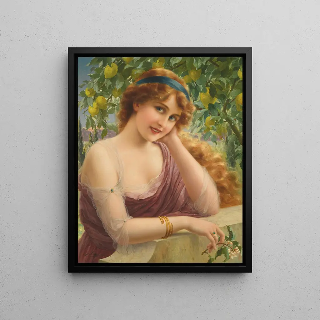 Im weiten Universum der Kunst gelingt es manchen Werken, die Essenz von Schönheit und Gelassenheit einzufangen. "Fille au citronnier - Émile Vernon" ist eines dieser Werke, das nicht nur eine raffinierte Ästhetik vermittelt, sondern auch eine Atmosphäre voller Sanftheit und Nostalgie. Dieses Gemälde, das ein junges Mädchen mit verträumtem Blick zeigt, steht zart vor einem blühenden Zitronenbaum, Symbol für eine üppige Natur und ein friedliches Leben. Der Künstler, durch seine Fähigkeit, mit Licht und Farben zu spielen, entführt uns in eine Welt, in der die Zeit stillzustehen scheint, und lädt den Betrachter ein, die Szene mit Staunen zu erleben.
