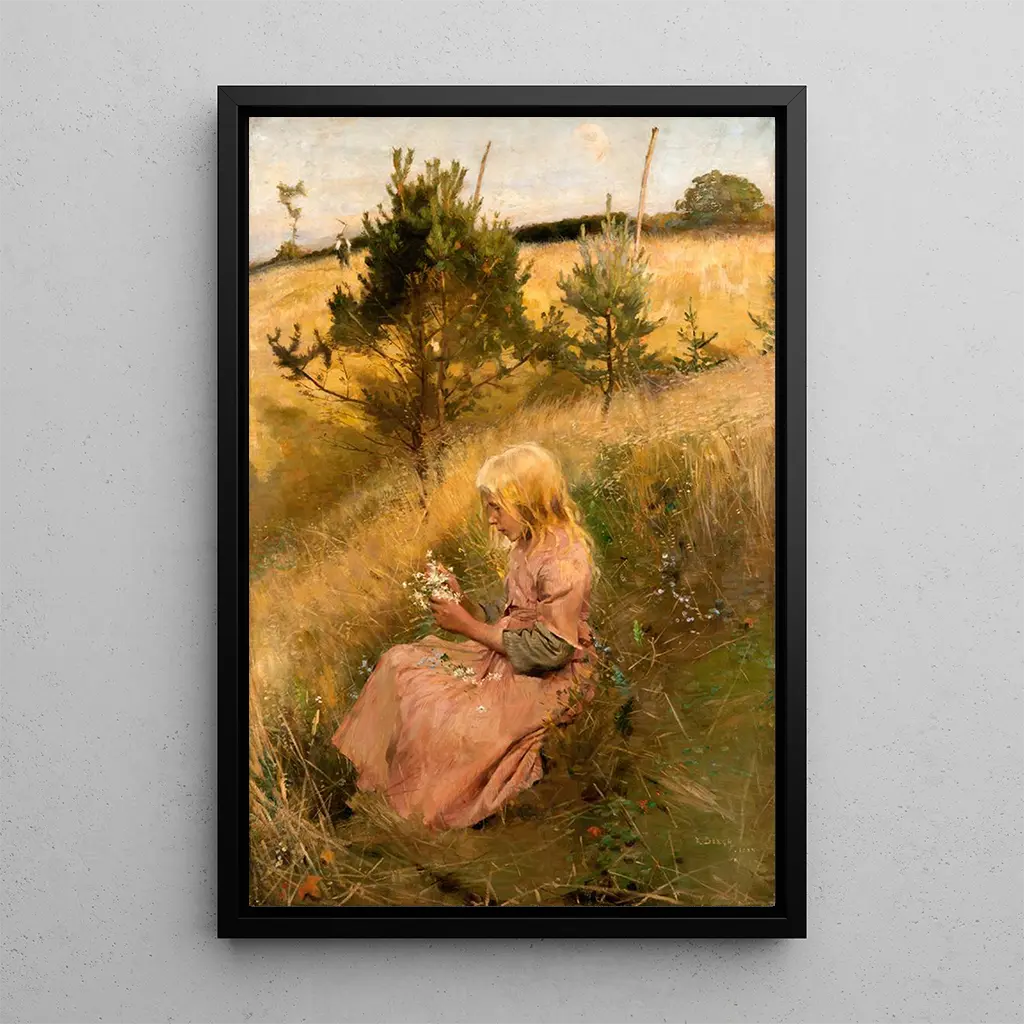 Richard Bergh, schwedischer Maler des 19. Jahrhunderts, ist bekannt für seinen Stil, der Realismus mit einem impressionistischen Touch verbindet. Beeinflusst von den künstlerischen Strömungen seiner Zeit, konnte er alltägliche Momente mit besonderer Sensibilität einfangen. Bergh studierte an der Königlichen Kunstakademie Stockholm und wurde auf europäischen Kunstmessen während seiner Reisen ausgestellt. Seine Werke, oft mit Themen aus Natur und häuslichem Leben, zeugen von einer Epoche, in der die Kunst versuchte, Emotionen durch einfache, aber ausdrucksstarke Szenen zu vermitteln. „Mädchen, das Blumen pflückt“ ist ein perfektes Beispiel für sein Talent, die vergängliche Schönheit der Kindheit festzuhalten.