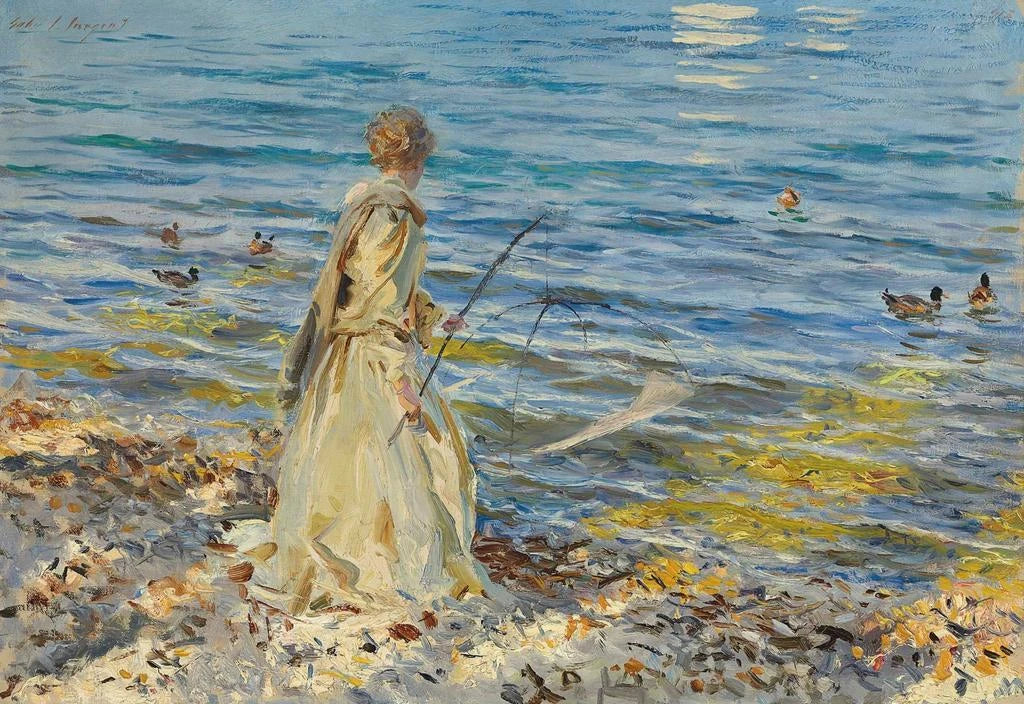 John Singer Sargent, geboren 1856, gilt als einer der bedeutendsten Porträtkünstler seiner Zeit. Ausgebildet in Paris, wurde er von den Impressionisten beeinflusst, entwickelte jedoch einen einzigartigen Stil, der Realismus und Impressionismus vereint. Sargent reiste durch Europa und die Vereinigten Staaten und erfasste Szenen des Alltags sowie Porträts einflussreicher Persönlichkeiten. Mädchen beim Angeln, obwohl weniger bekannt als seine Porträts, zeigt sein Talent, flüchtige Momente und die Schönheit der Natur einzufangen. Dieses Werk zeugt von seiner Fähigkeit, mit Licht und Schatten zu spielen – eine wesentliche Eigenschaft seiner Arbeit.