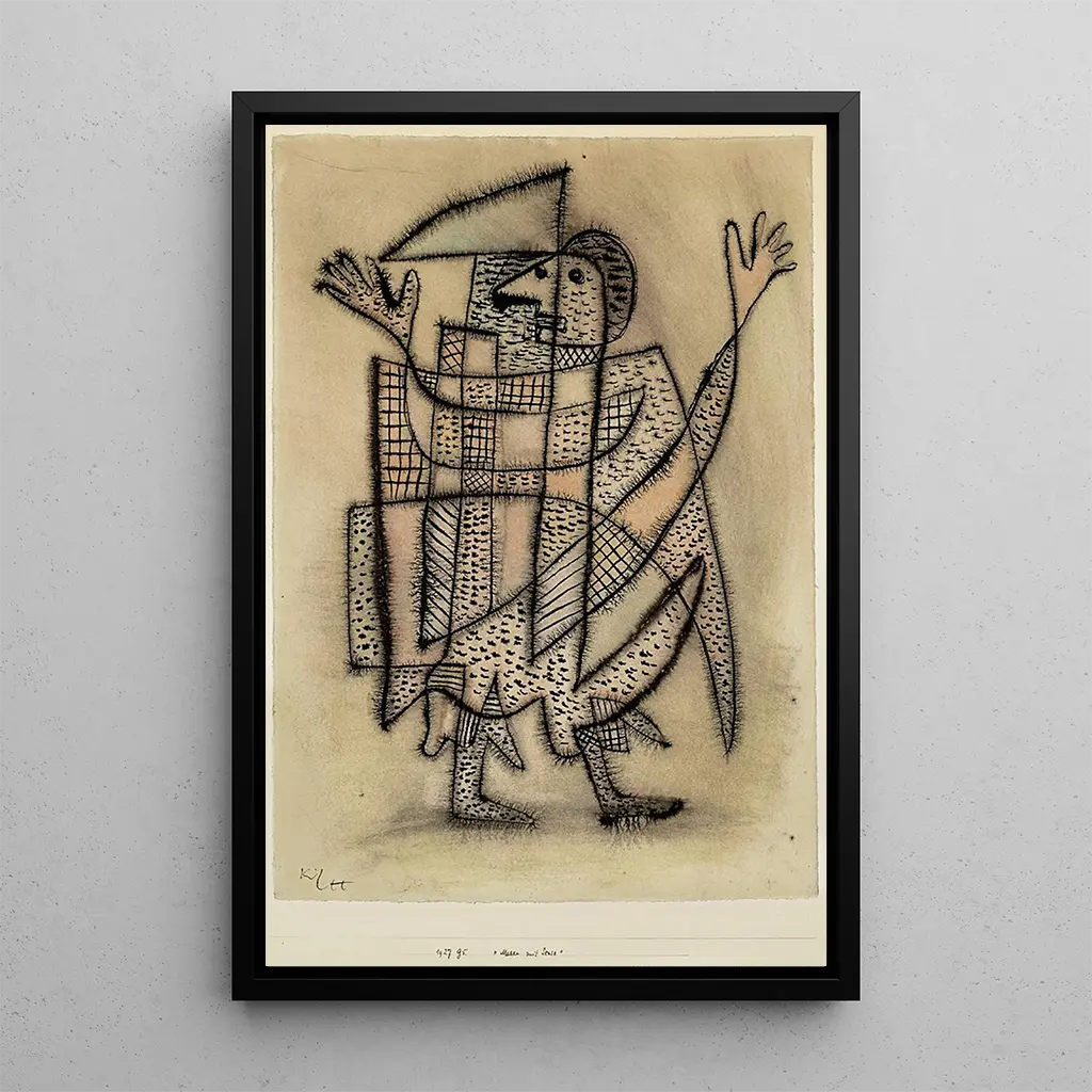 In der Leinwand "Maske mit Faux" taucht uns Paul Klee in eine traumhafte Welt ein, in der Formen und Farben sich auf poetische Weise verweben. Die warmen und lebendigen Töne, die von Ockern bis zu tiefroten Farbtönen reichen, schaffen eine Atmosphäre, die sowohl geheimnisvoll als auch fesselnd ist. Die Technik von Klee, die Aquarell und Zeichnung kombiniert, erweckt eine Maske zum Leben, die gleichzeitig in der Zeit eingefroren und in Bewegung zu sein scheint, als wäre sie der Spiegel eines inneren Gedankens. Jeder Strich lädt dazu ein, die Tiefen der Fantasie zu erkunden, in denen die Maske zu einem Symbol für Identität und persönliche Ausdruckskraft wird.