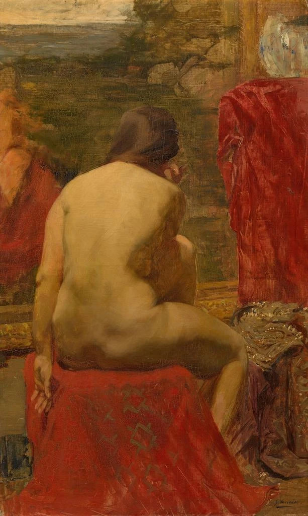 Das Gemälde Modell von Gustave Vanaise präsentiert sich als eindrucksvolle Erforschung der menschlichen Schönheit, eingefangen durch fließende Linien und harmonische Farben. Die Komposition hebt das Motiv mit einer Zartheit hervor, die sowohl Sinnlichkeit als auch Verletzlichkeit evoziert. Der Künstler verwendet warme Töne und subtile Schatten, um eine einhüllende Atmosphäre zu schaffen, die den Betrachter einlädt, die Anmut und Eleganz des Modells zu bewundern. Jeder Pinselstrich scheint vor Emotion zu vibrieren, was dieses Werk tief berührend und zeitlos macht.