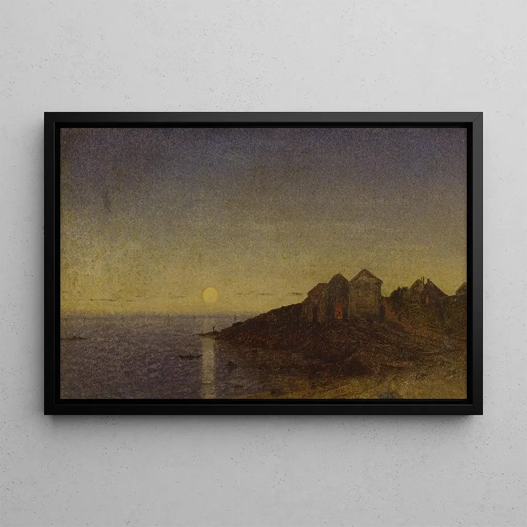 Clair de lune, werk von James Augustus Suydam, ruft die Magie einer ruhigen Nacht hervor, durchdrungen vom sanften Licht des Mondes. Dieser zarte kunstdruck fängt eine idyllische Landschaft ein, in der silberne Reflexe auf dem ruhigen Wasser tanzen und eine Traum- und Ruheatmosphäre schaffen. Die Nuancen von Blau und Violett, subtil vermischt, verleihen der Leinwand eine romantische und melancholische Stimmung. Die impressionistische Technik von Suydam, mit ihren fließenden Pinselstrichen, ermöglicht es, die Frische der Nacht und die vergängliche Schönheit der Natur zu spüren. Dieses Gemälde lädt zur Kontemplation und Flucht ein und bietet einen Moment der Gelassenheit für diejenigen, die es betrachten.