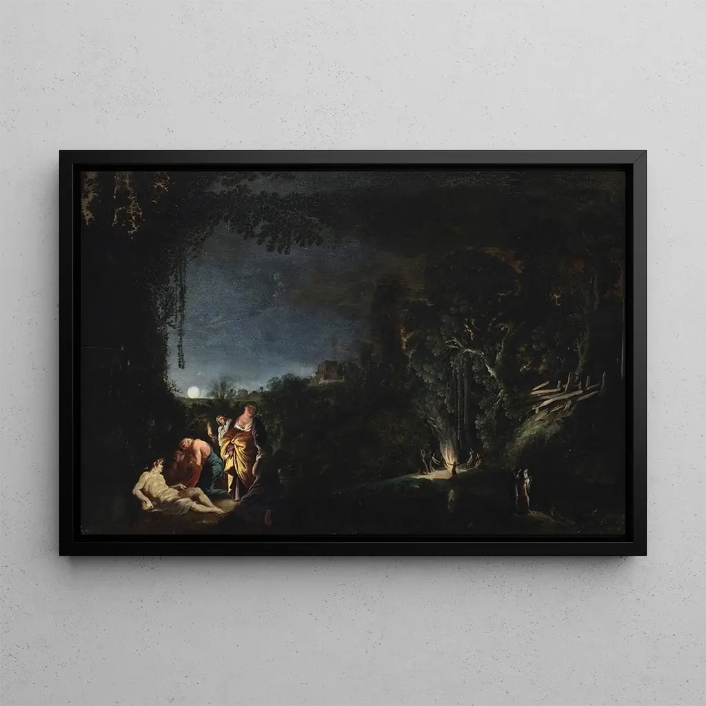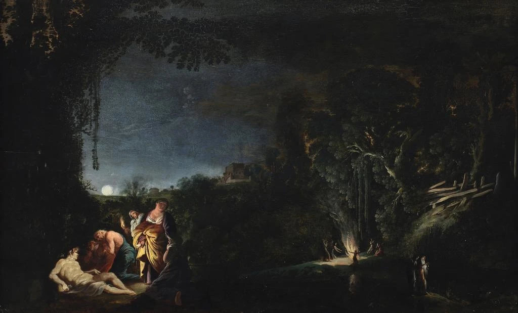 Dieses fesselnde Gemälde von Moyses van Uyttenbroeck evoziert eine mystische Atmosphäre, in der der Mond eine verzauberte Landschaft erleuchtet. Die silbernen und bläulichen Töne verschmelzen harmonisch und schaffen einen eindrucksvollen Kontrast zu den mythologischen Motiven, die die Leinwand bevölkern. Die Technik des Künstlers, die Feinheit und minutiöse Details vereint, ermöglicht es, in eine Welt einzutauchen, in der Traum und Wirklichkeit verschmelzen. Jedes Element, von den nebelhaften Wolken bis zu den mythologischen Silhouetten, lädt zu einer tiefen Betrachtung ein und bietet eine Flucht in eine magische Welt.