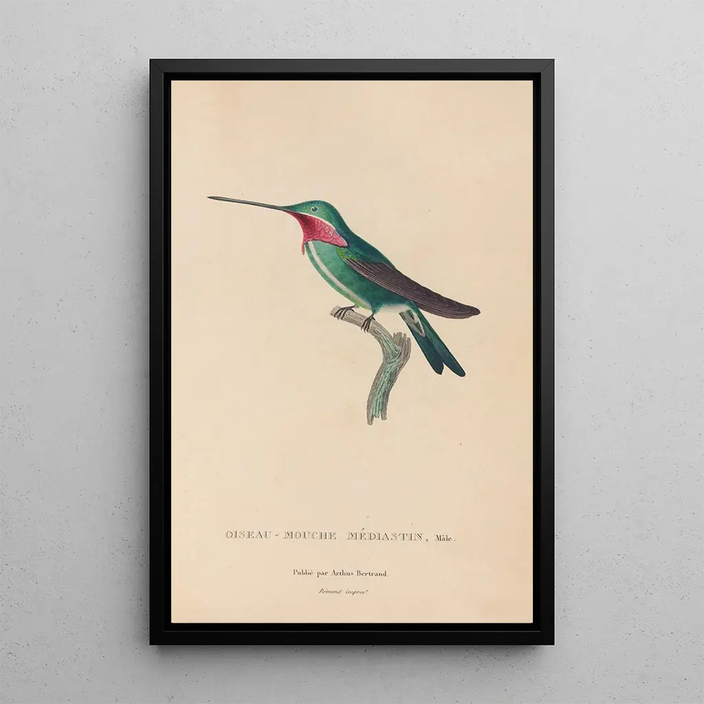 Histoire naturelle des oiseaux-mouches Pl29 : eine Feier der avianen Biodiversität Die reproduction Histoire naturelle des oiseaux-mouches Pl29 ist ein lebendiges Kunstwerk, das die vergängliche Schönheit der Vögel mit Flügeln einfängt. Die leuchtenden Farben, die von Smaragdgrün bis zu leuchtendem Rot reichen, verschmelzen harmonisch und schaffen eine lebendige und fröhliche Atmosphäre. Die von René Primevère Lesson verwendete Gravurtechnik ermöglicht es, jedes Detail der Gefieder mit bemerkenswerter Präzision darzustellen, fast fühlbar. Dieses Leinwandbild lädt zu einer aufmerksamen Betrachtung ein und offenbart die Zartheit und Anmut dieser geflügelten Kreaturen, während es gleichzeitig eine reiche und faszinierende natürliche Welt evoziert. René Primevère Lesson : ein Pionier der künstlerischen Ornithologie René Primevère Lesson, Naturforscher und Ornithologe des 19. Jahrhunderts, spielte eine entscheidende Rolle bei der Dokumentation der Vogelarten. Seine Arbeit ist Teil der wissenschaftlichen Bewegung jener Zeit, in der Beobachtung und Klassifikation der Arten oberste Priorität hatten. Beeinflusst von den botanischen und zoologischen Expeditionen seiner Zeit, konnte Lesson Wissenschaft und Kunst verbinden, sodass seine Werke nicht nur informativ, sondern auch ästhetisch ansprechend sind. Sein Erbe besteht fort, da seine Illustrationen weiterhin Ornithologie- und Kunstliebhaber inspirieren und die Bedeutung der Natur in der Kunst bezeugen. Eine dekorative Anschaffung mit vielfältigen Vorteilen Die reproduction des Gemäldes Histoire naturelle des oiseaux-mouches Pl29 ist eine ideale dekorative Wahl für verschiedene Räume wie Wohnzimmer, Büro oder Schlafzimmer. Die Druckqualität garantiert eine bemerkenswerte Treue zu den Farben und Details des Originalwerks und bringt einen Hauch von Natur und Raffinesse in Ihr Zuhause. Die ästhetische Anziehungskraft dieses Leinwandbildes macht es zu einem faszinierenden Blickfang, der Bewunderung und Gespräche hervorruft. Durch die Integration dieses Kunstwerks in Ihre Dekoration fügen Sie nicht nur ein Kunstwerk hinzu, sondern auch eine Hommage an die Schönheit der Biodiversität.