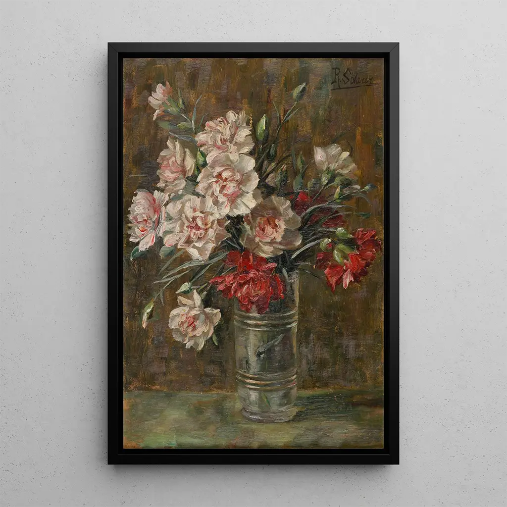 Nelken in einer Vase: eine Feier der vergänglichen Schönheit. Die Leinwand "Nelken in einer Vase" von Rosa Scherer taucht uns in eine lebendige Blumenwelt ein, in der die leuchtenden Farben der Blumen mit der Sanftheit pastellfarbener Nuancen verschmelzen. Die sorgfältig komponierte Darstellung hebt zarte Nelken mit filigranen Blütenblättern hervor, die das Licht auf fast magische Weise einfangen. Die Technik von Scherer, die Realismus und Impressionismus verbindet, schafft eine ruhige und kontemplative Atmosphäre, die den Betrachter einlädt, die flüchtige Schönheit der Natur zu bewundern. Jeder Pinselstrich scheint das Leben einzufangen und ehrt die Zerbrechlichkeit und Pracht der Blumen. Rosa Scherer: eine Pionierin der Blumenmalerei im 19. Jahrhundert. Eine produktive Künstlerin des 19. Jahrhunderts, Rosa Scherer spezialisierte sich auf die Blumenmalerei, ein Genre, das in dieser Epoche an Popularität gewann. Beeinflusst von den künstlerischen Bewegungen ihrer Zeit, entwickelte sie einen einzigartigen Stil, der botanische Präzision mit künstlerischer Sensibilität verbindet. Obwohl weniger bekannt als ihre Zeitgenossen, trug ihre Arbeit zur Entwicklung der Blumenmalerei bei und markierte einen wichtigen Meilenstein in der Kunstgeschichte. Ihre Werke, oft in Salons ausgestellt, zeugen von ihrem Talent und ihrem Engagement für die Darstellung der Natur. Eine dekorative Anschaffung mit vielfältigen Vorzügen. Die kunstdruck-Reproduktion des Gemäldes "Nelken in einer Vase" ist eine ideale Wahl, um Ihr Zuhause zu verschönern, sei es im Wohnzimmer, im Büro oder im Schlafzimmer. Die Druckqualität garantiert eine bemerkenswerte Farbtreue und Detailgenauigkeit des Originalwerks und verleiht Ihrer Dekoration einen Hauch von Eleganz und Frische. Mit ihrer unbestreitbaren ästhetischen Anziehungskraft zieht diese Leinwand den Blick auf sich und regt Gespräche an, während sie eine ruhige und einladende Atmosphäre schafft. In diese kunstdruck-Reproduktion zu investieren bedeutet, die Schönheit der Natur im Alltag zu feiern.