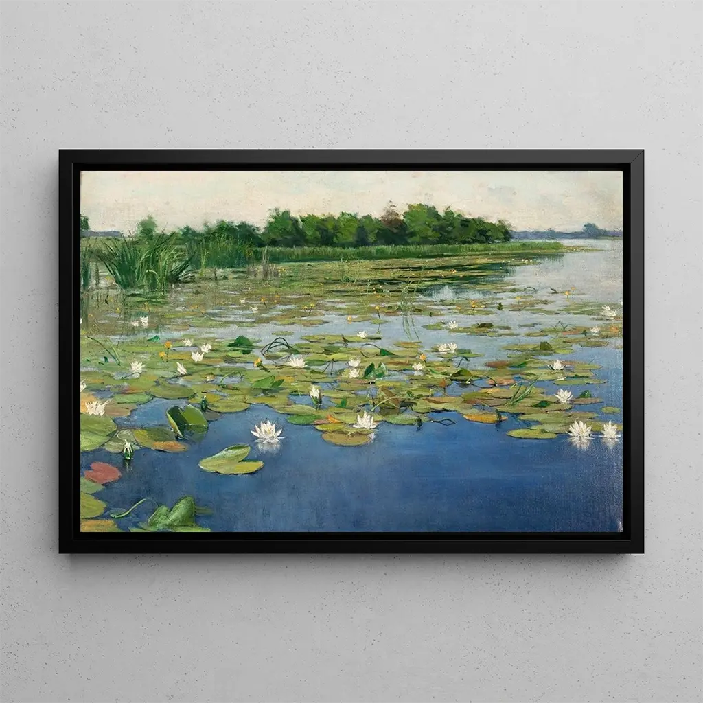 Die Nénuphars von Henryk Weyssenhoff fangen die Essenz eines ruhigen Teichs ein, auf dem das Licht auf den Wasseroberflächen spielt. Dieses Gemälde, reich an Nuancen von Grün und Blau, ruft eine ruhige und kontemplative Atmosphäre hervor. Die zarten Blumen, die anmutig an der Oberfläche treiben, scheinen den Betrachter einzuladen, in diese idyllische Landschaft einzutauchen. Die Technik des Künstlers, die Impressionismus und Realismus verbindet, verleiht dem Werk eine Tiefe, die den einfachen natürlichen Hintergrund übertrifft und jeden Pinselstrich zu einer Feier der vergänglichen Schönheit macht.