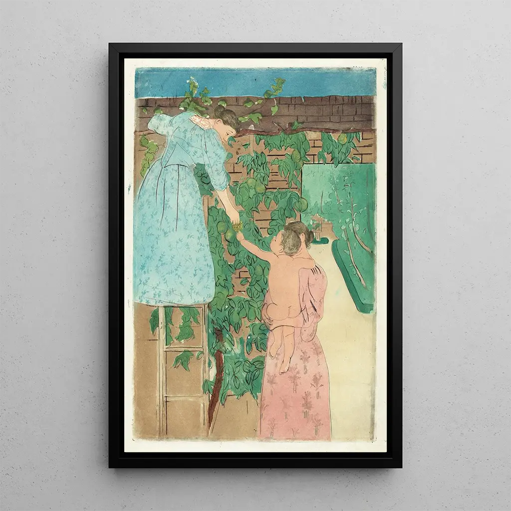 Die kunstdruck von "Cueillette de fruits" von Mary Cassatt zeigt eine intime Szene, in der Sanftheit und Licht sich harmonisch verbinden. Die pastellfarbenen, zarten und leuchtenden Töne verleihen eine ruhige und fröhliche Atmosphäre. Die impressionistische Technik von Cassatt zeigt sich in flüssigen Pinselstrichen, die die Leichtigkeit der Bewegungen der Figuren einfangen. Dieses Werk, das Frauen beim Früchtepflücken darstellt, lädt uns ein, die Schönheit der einfachen Momente des Alltags zu bewundern, während es die Bedeutung familiärer und freundschaftlicher Beziehungen betont.