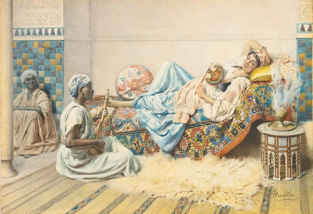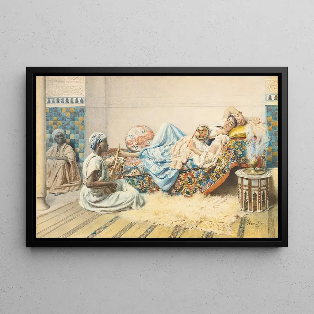 Federico Bartolini, aktiv im 19. Jahrhundert, ist ein italienischer Maler, dessen Werk im romantischen Stil verankert ist. Beeinflusst von den künstlerischen Strömungen seiner Zeit, integrierte er orientalistische Elemente in seine Werke, die eine Faszination für den Orient und seine Geheimnisse widerspiegeln. Bartolini wurde an italienischen Akademien ausgebildet, wo er einen persönlichen Stil entwickelte, der Realismus und Idealisierung verbindet. L'Odalisque ist eines seiner bekanntesten Werke und zeugt von seiner Fähigkeit, die weibliche Schönheit einzufangen und exotische Atmosphären zu beschreiben, während er sich im künstlerischen Kontext seiner Epoche bewegt.