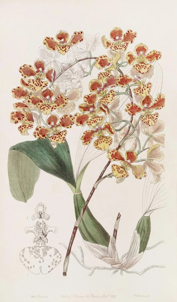 Sydenham Edwards, aktiv zu Beginn des 19. Jahrhunderts, gilt als einer der bedeutendsten namen der botanischen illustration. Vom romantischen bewegung beeinflusst, verstand er es, die Schönheit der pflanzen mit einer einzigartigen sensibilität einzufangen. Seine werken, häufig veröffentlicht in botanischen werken, zeugen von seinem engagement, die vielfältigkeit der flora zu ehren. Der oncid frangé ist in eine zeit eingebettet, in der das interesse an der botanischen wissenschaft florierte, und Edwards spielte eine entscheidende rolle bei der verbreitung dieses wissens durch seine illustration. Sein erbe besteht fort und inspiriert noch heute botaniker und kunstliebhaber.
