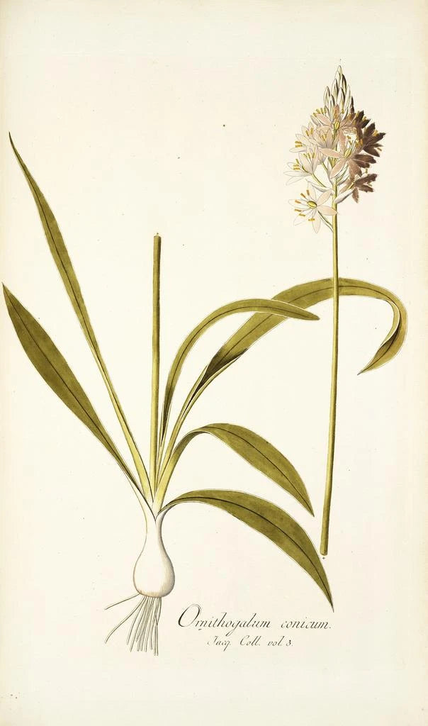 Nikolaus Joseph Freiherr von Jacquin, botaniker und künstler des 18. jahrhunderts, spielte eine entscheidende rolle bei der entwicklung der botanischen illustration. Er wurde in Wien ausgebildet, war beeinflusst von den wissenschaftlichen entdeckungen seiner zeit und reiste in kolonien, um die lokale flora zu studieren. Seine arbeit trug zum verständnis exotischer pflanzen und zur dokumentation der biodiversität bei. 'Ornithogalum conicum' reiht sich in diese tradition ein, die wissenschaftliche strenge und künstlerische sensibilität vereint. Jacquin ist bekannt für seine fähigkeit, kunst und wissenschaft zu verbinden, was seine werke zu unverzichtbaren referenzen für botaniker und künstler macht.