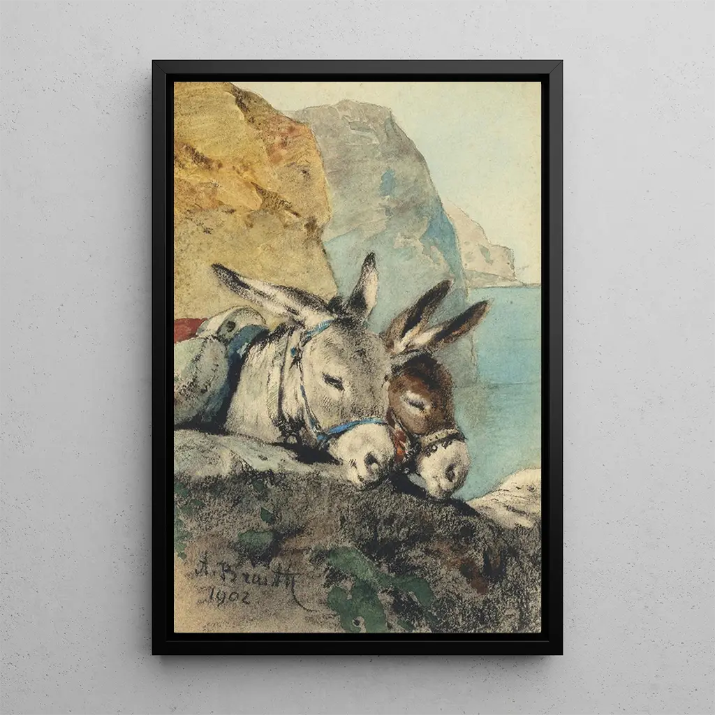 Paar von Eseln, Grüße vom Gardasee: eine bucolische Reproduktion Die Reproduktion von Paar von Eseln, Grüße vom Gardasee von Anton Braith entführt uns in eine ländliche Landschaft voller Sanftheit. Dieses Werk zeigt zwei Esel in einer idyllischen Naturlandschaft, in der das Licht auf Formen und Texturen spielt. Die erdigen Farben und Grüntöne vermitteln eine beruhigende Gelassenheit, während die Ausdrücke der Tiere von einer berührenden Verbundenheit zeugen. Die Technik von Braith, die Realismus und Romantik verbindet, erweckt diese Szene zum Leben und lädt den Betrachter ein, die schlichte Schönheit der Natur zu genießen. Anton Braith: ein Maler der Natur und der Tiere Anton Braith, deutscher Künstler des 19. Jahrhunderts, ist bekannt für seine Darstellungen von Fauna und Flora. Beeinflusst von der romantischen Bewegung, konnte er die Essenz seiner Motive mit besonderer Sensibilität einfangen. Seine Karriere wurde durch Reisen nach Italien geprägt, wo er Inspiration in malerischen Landschaften und dem Landleben fand. Braith war auch ein Vorreiter in der Tierkunst und hob die Schönheit und Intelligenz der Tiere in seinen Werken hervor. Paar von Eseln, Grüße vom Gardasee ist ein perfektes Beispiel für sein Talent, harmonische und bewegende Kompositionen zu schaffen. Eine dekorative Anschaffung mit vielfältigen Vorzügen Die Reproduktion von Paar von Eseln, Grüße vom Gardasee ist ein dekoratives Stück, das Ihrem Interieur einen rustikalen Charme verleiht. Ob im Wohnzimmer, in der Küche oder im Büro, dieses Bild überzeugt durch seine Druckqualität und seine visuelle Anziehungskraft. Seine Treue zu den Details und den originalen Farben macht es zur idealen Wahl für Liebhaber der Tierkunst und der Natur. Durch die Integration dieses Leinwandbildes in Ihre Dekoration schaffen Sie eine warme und einladende Atmosphäre und feiern gleichzeitig die Schönheit ländlicher Szenen.