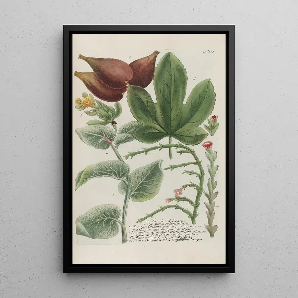 Die reproduction von Phytanthoza iconographia Pl231 entführt uns in eine reiche und detaillierte Blumenwelt. Die lebendigen Farben, die von leuchtendem Grün bis zu zarten Nuancen von Rosa und Gelb reichen, fangen die Essenz der Natur ein. Die von Johann Wilhelm Weinmann verwendete Gravurtechnik hebt jedes Blütenblatt und jede Blattform hervor und schafft eine Atmosphäre, die sowohl beruhigend als auch faszinierend ist. Dieses Werk, eine wahre Ode an die Botanik, lädt den Betrachter ein, die Schönheit der Pflanzen aus einer neuen Perspektive zu entdecken und gleichzeitig die Präzision der Arbeit des Künstlers zu bewundern.