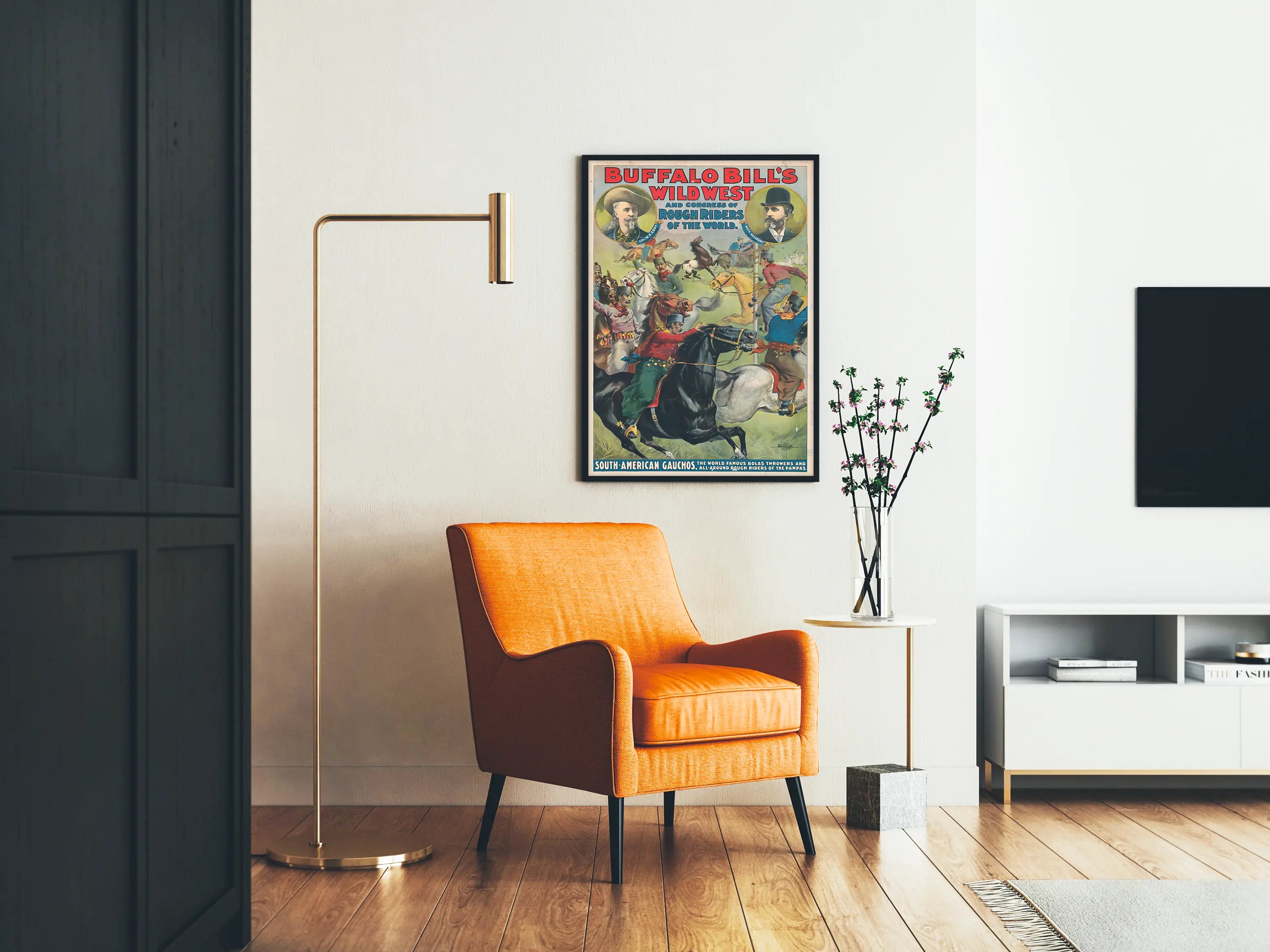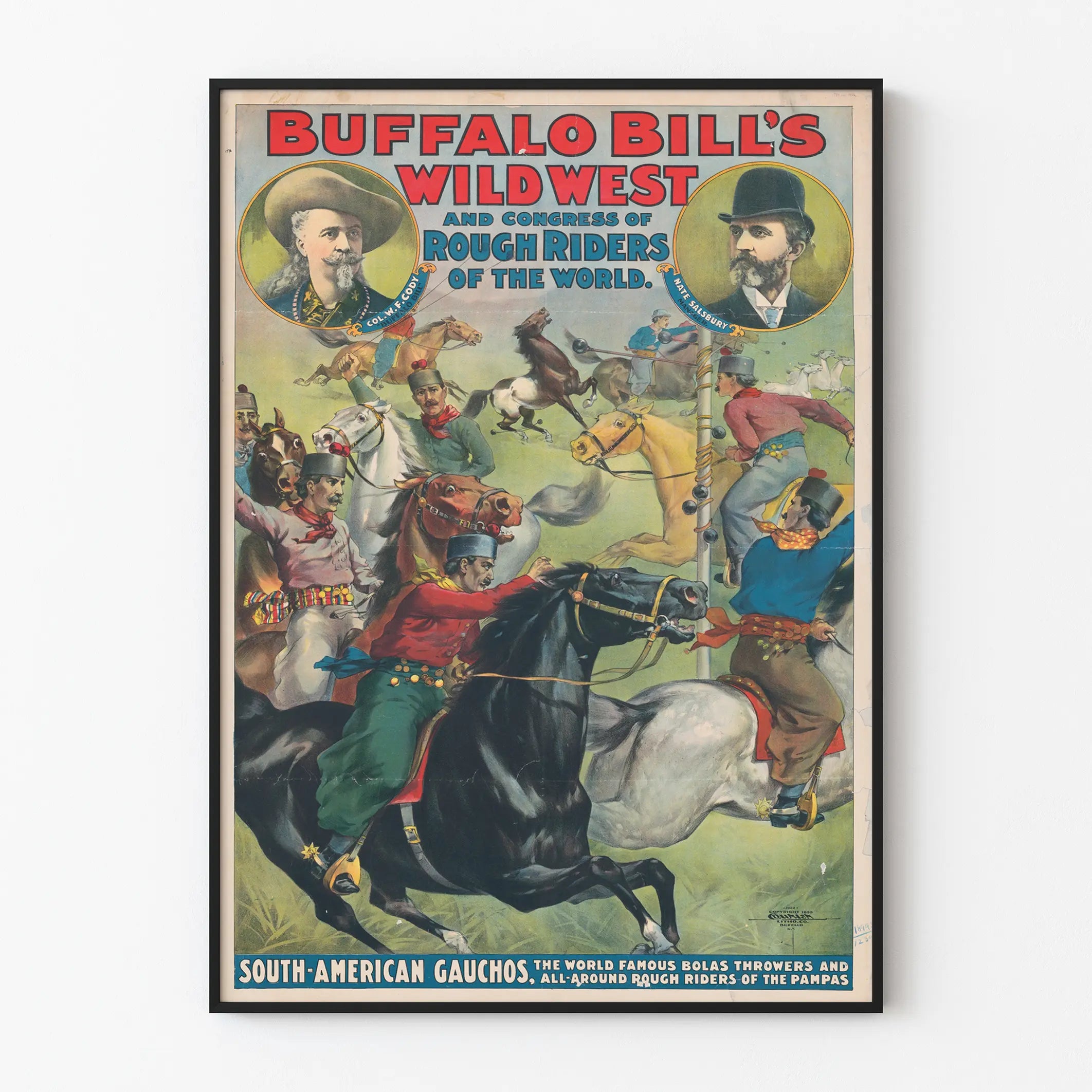 Dieses faszinierende Vintage-Poster zeigt den Wilden Westen von Buffalo Bill und den Kongress der rauen Reiter der Welt, mit den berühmten südamerikanischen Gauchos. Das Plakat stellt eine dynamische Szene von Reitern in traditioneller Kleidung dar, die den Wurf der Bolas ausführen – eine ikonische Kunst der südamerikanischen Pampa. Die in Bewegung befindlichen Pferde und die Figuren der Reiter erzeugen einen Eindruck von Bewegung und Energie, ideal für eine Wanddekoration inspiriert vom Wilden Westen und den Reittraditionen. Mit seinen leuchtenden Farben und seinem detaillierten Grafikdesign ist dieses Wandbild perfekt für Liebhaber historischer Kultur, amerikanischer und südamerikanischer Abenteuer. Die Porträts von Oberst W.F. Cody und Nate Salsbury rahmen die Szene ein und verleihen diesem fahrenden Show-Poster eine Note von Authentizität. Sein einzigartiger Vintage-Stil macht es zur idealen Wahl, um eine Sammlung von Postern zu bereichern oder einen historischen und dekorativen Akzent in einem modernen oder rustikalen Interieur zu setzen. Dieses Wanddekoration-Poster ruft den Geist des Abenteuers und das Leben im Sattel wach und ehrt die Traditionen der Gauchos sowie das Erbe der Buffalo Bill's Wild West-Show.