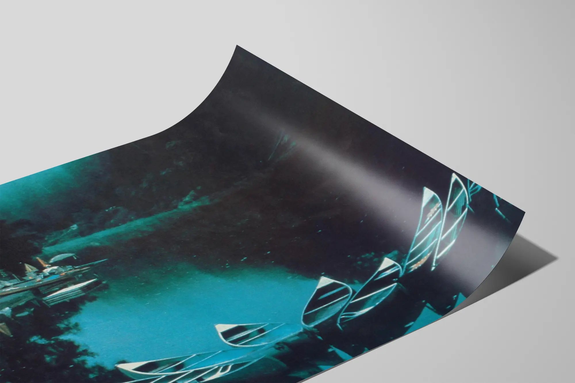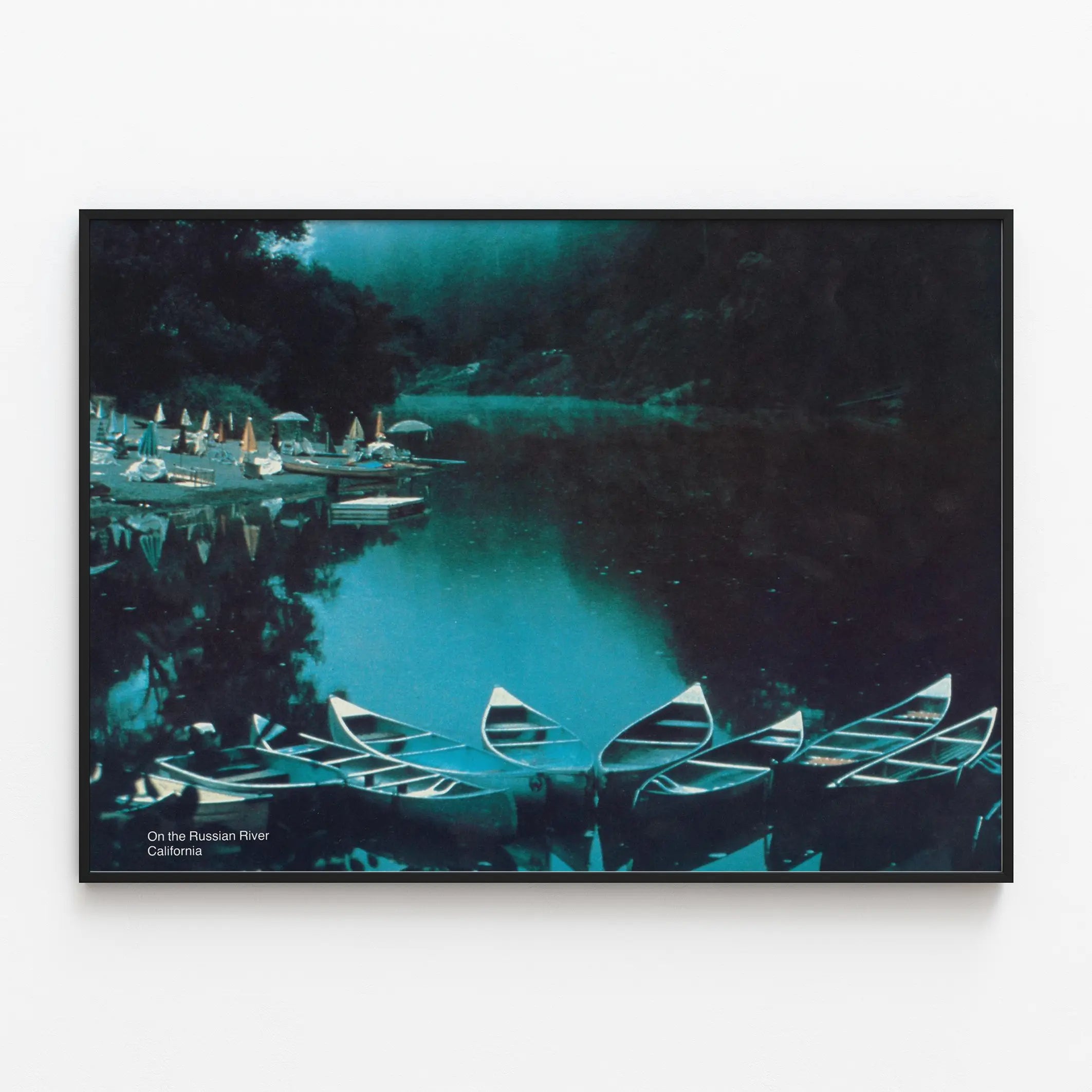 Bringen Sie eine Prise von Gelassenheit und Flucht in Ihre Wanddekoration mit diesem Poster, das eine friedliche Landschaft am Fluss Russian in Kalifornien zeigt. Dieses Bild hebt eine Gruppe von Kanus hervor, die in einem Fächer auf dem ruhigen Wasser angeordnet sind und die natürliche Schönheit sowie die Ruhe des Ortes widerspiegeln. Die Szene ist von einem sanften Licht durchflutet, das die tiefen Nuancen von Blau und Grün betont und eine beruhigende Atmosphäre schafft, ideal für einen Wohnraum oder ein Büro.