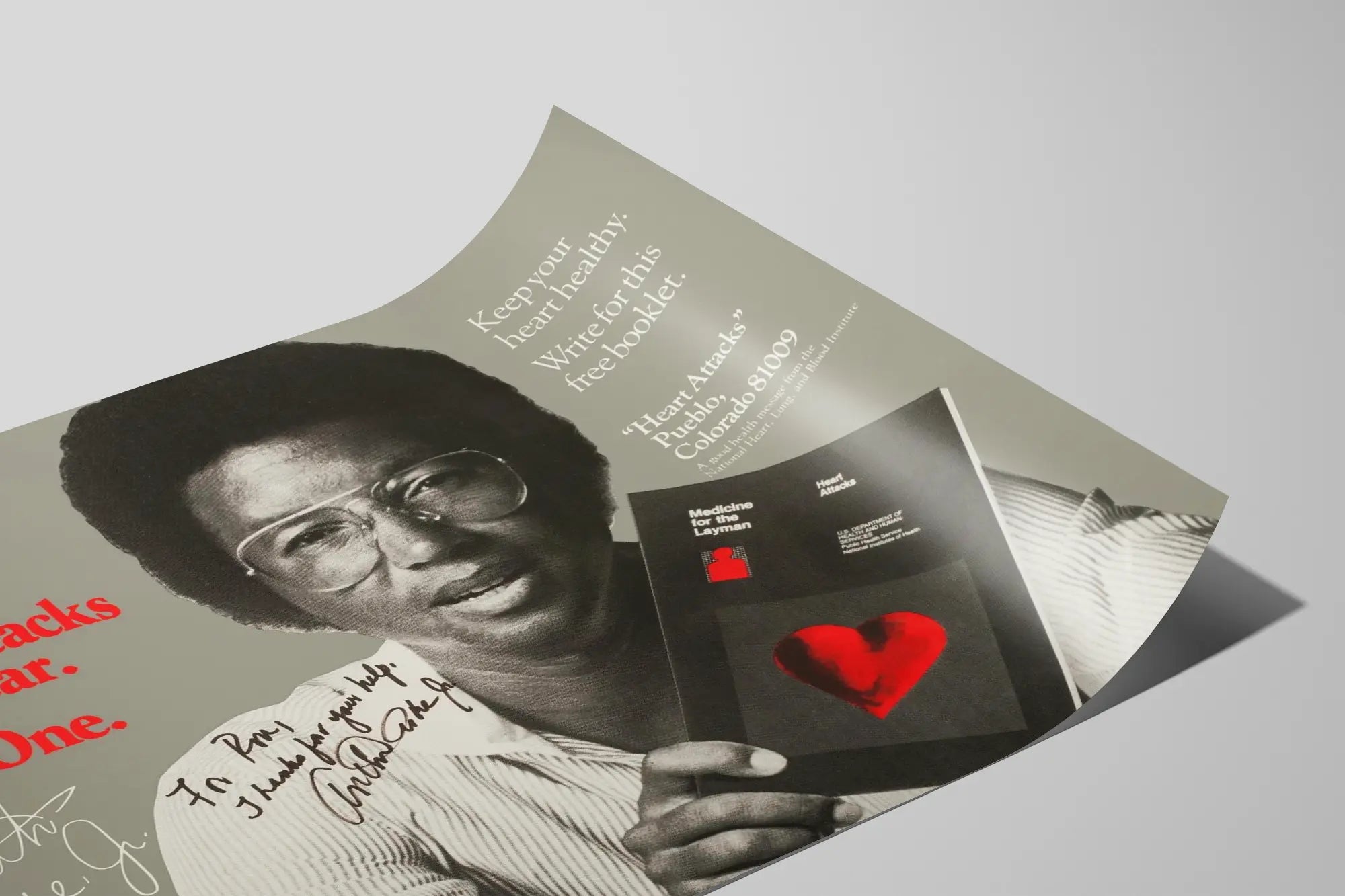 Dieses Vintage-Poster zur Sensibilisierung für Herzkrankheiten lenkt die Aufmerksamkeit auf eine entscheidende öffentliche Gesundheitsbotschaft: Jährlich erleiden eine Million Amerikaner einen Herzinfarkt. Das Bild zeigt ein Schwarz-Weiß-Porträt eines Mannes mit Brille, der ein Heft mit dem Titel „Medizin für Laien“ hält, das sich mit Herzinfarkten beschäftigt. Der leuchtend rote und eindringliche Text „Eine Million Amerikaner erleiden jedes Jahr Herzinfarkte. Ich war einer davon.“ unterstreicht die Schwere des Problems und liefert gleichzeitig eine starke persönliche Aussage. Dieses Wanddekoration-Poster verbindet eine Retro-Ästhetik mit einer kraftvollen Botschaft, ideal für ein industriell oder modern gestaltetes Interieur, das Kunst und gesellschaftliches Engagement vereinen möchte. Das auf dem Poster erwähnte Heft verstärkt die pädagogische Wirkung des Posters und erinnert an die Bedeutung der Herzgesundheit. Die handschriftliche Notiz, die dem Bild hinzugefügt wurde, verleiht eine persönliche und authentische Note und betont die menschliche Dimension sowie die Nähe zur Botschaft. Als Wanddekoration ist dieses Poster perfekt für Gesundheitseinrichtungen, Arztpraxen oder für jeden, der ein informatives und zugleich ästhetisches Element in sein Zuhause integrieren möchte. Das ausgewogene Design aus Fotografie und Typografie vermittelt ein ernstes Thema auf eine visuell zugängliche Weise. Der Kontrast zwischen dem grauen Hintergrund und dem roten Text zieht die Aufmerksamkeit natürlich auf sich und sorgt für einen sofortigen Eindruck in jedem Raum. Ideal, um eine Sammlung von Vintage-Postern oder Botschaftsplakaten zu ergänzen, stellt dieses Wandbild auch ein ansprechendes visuelles Werkzeug zur Sensibilisierung für die Prävention von Herz-Kreislauf-Erkrankungen dar. Jedes Element des Posters ist darauf ausgelegt, eine klare Botschaft über die Bedeutung eines gesunden Lebensstils und die Notwendigkeit zugänglicher Informationen zu vermitteln. Es ist ein Wanddekoration-Objekt, das im Gedächtnis bleibt und sich harmonisch in ein modernes Ambiente einfügt. Mit diesem Poster bringen Sie ein Stück gesellschaftliches Bewusstsein in Ihre Inneneinrichtung, durch ein kraftvolles, bedeutungsvolles Bild und einen zeitlosen Stil.