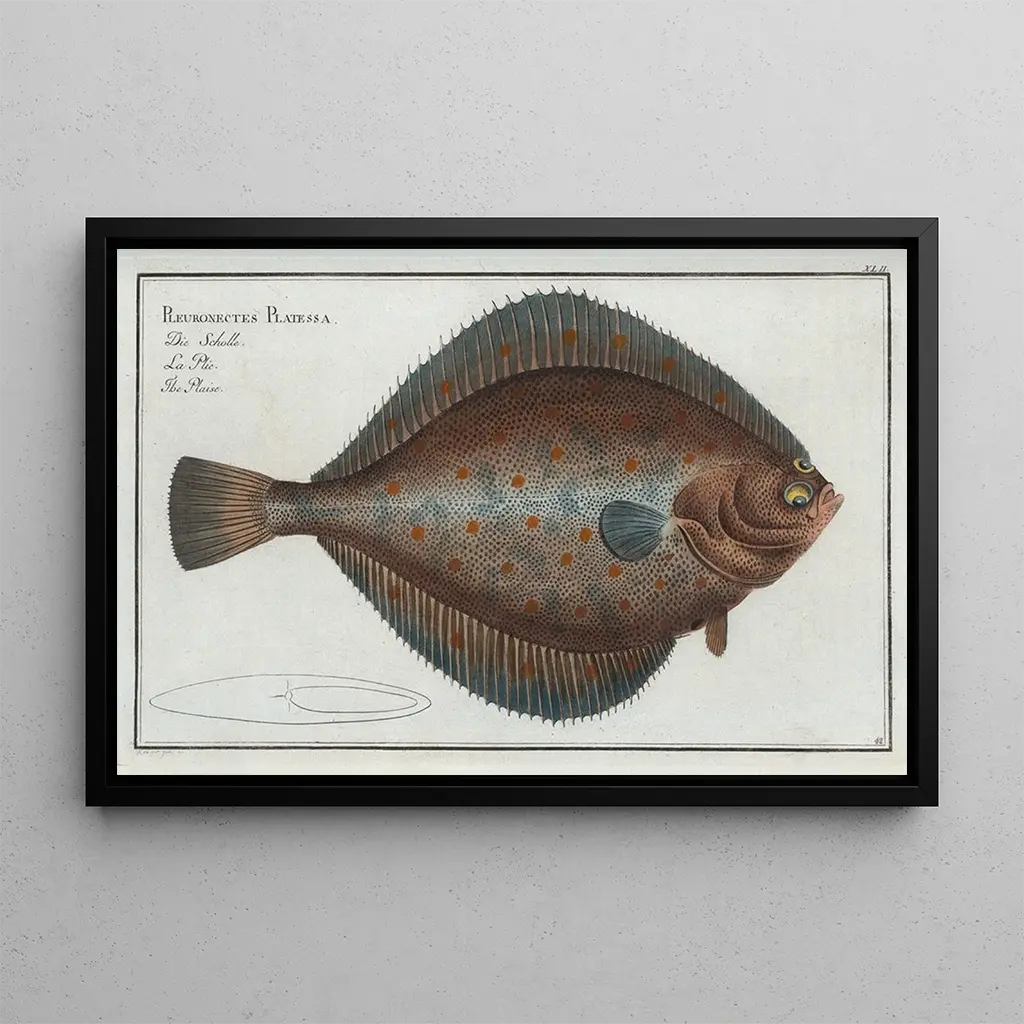 Pleuronectes platessa, die Flunder : eine Studie der aquatischen Natur In "Pleuronectes platessa, die Flunder" bietet Marcus Elieser Bloch eine faszinierende Darstellung dieses flachen Fisches, emblematisch für die europäischen Küsten. Das Leinwandbild hebt die zarten Details der Haut der Flunder hervor, mit ihren Nuancen von Beige und Braun, die sich harmonisch in ihre aquatische Umgebung einfügen. Die von Bloch verwendete Gravurtechnik ermöglicht es, die Textur und die Feinheiten der Anatomie dieses Fisches wiederzugeben, während sie gleichzeitig eine ruhige und kontemplative Atmosphäre evoziert. Dieses Gemälde ist eine wahre Ode an die marine Biodiversität. Marcus Elieser Bloch: ein Naturforscher im Dienste der Kunst Marcus Elieser Bloch, geboren 1723, ist ein deutscher Künstler und Naturforscher, dessen Arbeit einen bedeutenden Einfluss auf die zoologische Illustration hatte. Aktiv im 18. Jahrhundert, ist er vor allem bekannt für seine Werke über Fische, die wissenschaftliche Präzision und künstlerische Sensibilität verbinden. Seine akribische Herangehensweise und sein Augenmerk auf Details machen ihn zu einem Pionier im Bereich der naturwissenschaftlichen Illustration. Durch seine Werke hat Bloch zum Verständnis der aquatischen Fauna beigetragen und das Publikum für die Schönheit der Meeresarten sensibilisiert. Eine dekorative kunstdruck mit vielfältigen Vorzügen Der kunstdruck von "Pleuronectes platessa, die Flunder" ist eine ideale dekorative Wahl für Liebhaber der Natur und des Meeres. Ob in einer Küche, einem Esszimmer oder einem Büro, dieses Leinwandbild bringt eine Note von Originalität und Eleganz. Seine Qualität der kunstdruck-Reproduktion garantiert eine Treue zu den Details und Farben des Originalwerks, sodass man eine beruhigende und inspirierende Atmosphäre genießen kann. Mit seinem ästhetischen Reiz wird dieses Werk zu einem Blickfang, der die Neugier und Bewunderung der Besucher weckt.