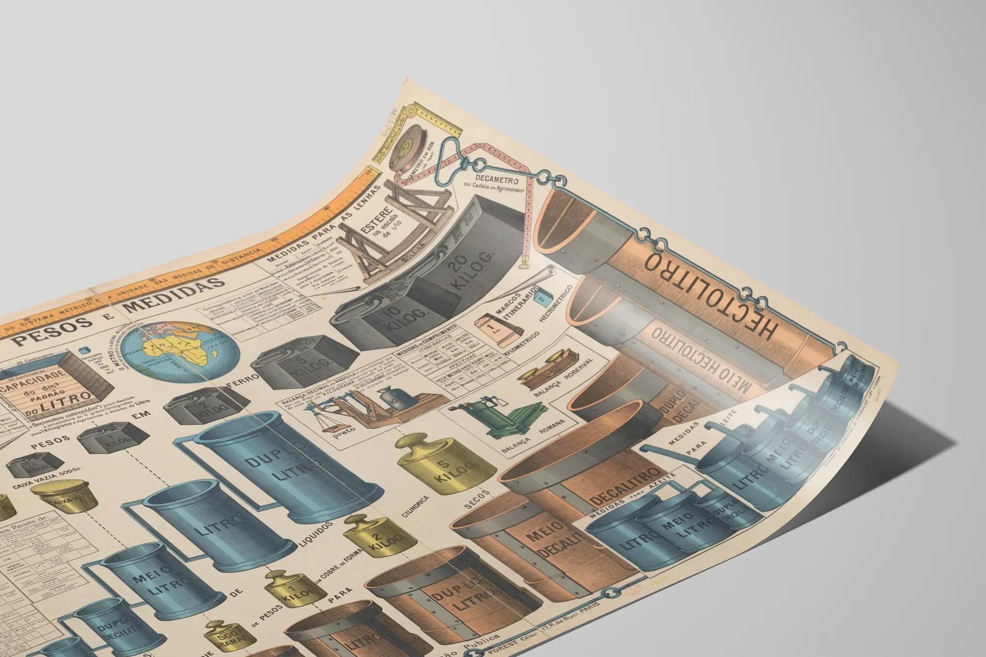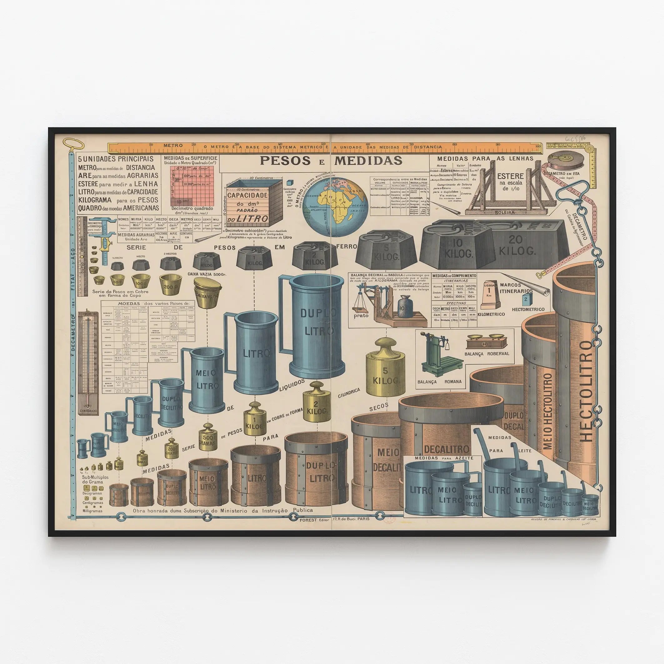 Dieses Vintage-Poster, das die verschiedenen Gewichte und Maße illustriert, ist ein perfektes Stück für eine Wanddekoration, die sowohl ästhetisch als auch lehrreich ist. Gedruckt im Retro-Stil, zeigt es klar und detailliert verschiedene Maßeinheiten wie Meter, Ar, Are, Liter, Kilogramm sowie Eisengewichte. Jede Einheit wird visuell durch realistische Abbildungen von Messobjekten dargestellt, wie Kupfergewichte, Volumenzylinder für Flüssigkeiten und Feststoffe sowie verschiedene Modelle von Waagen. Das Plakat hebt Messsysteme hervor, die zur Bestimmung von Entfernungen, Kapazitäten und Massen verwendet werden, mit erklärenden Tabellen, die die Entsprechung der Einheiten wie Quadratzentimeter oder Kubikmeter sowie zusammengefasste metrische Umrechnungen detailliert darstellen. Oben rechts sind präzise Modelle für Messungen von Holz und anderen Materialien zu sehen, die Skalen und Dekameter illustrieren und so die visuelle und pädagogische Vielfalt dieses Posters bereichern. Diese Wanddekoration ist ideal für Liebhaber des Vintage-Stils und für Räume, in denen ein lehrreiches Element integriert werden soll, wie ein Arbeitszimmer, eine Bibliothek oder ein Büro. Sie passt auch perfekt in wissenschaftlich oder historisch geprägte Innenräume. Die harmonische Gestaltung und das Gleichgewicht zwischen Text und Bild erleichtern das Lesen und verleihen einen originellen Akzent, während sie die Geschichte der Maße und Gewichtssysteme hervorheben. Die dezenten Farben und die geometrischen Formen dieses Posters verleihen einen alten Charme, bleiben dabei jedoch elegant und passen zu verschiedenen Einrichtungsstilen. Dieses Poster kann gerahmt oder einfach an die Wand gehängt werden, um eine weiße oder bunte Wand mit einem kulturellen und stilvollen Akzent zu verschönern. Perfekt für Wissenschaftsbegeisterte verbindet diese Wanddekoration Nützlichkeit mit Ästhetik und würdigt die Entwicklung der Maßeinheiten. Verleihen Sie Ihrem Raum eine einzigartige Note mit diesem Vintage-Poster über Gewichte und Maße – eine kluge Wahl, um Ihre Dekoration mit einem Werk zu bereichern, das eine Geschichte erzählt und gleichzeitig Ihren Innenraum verschönert.