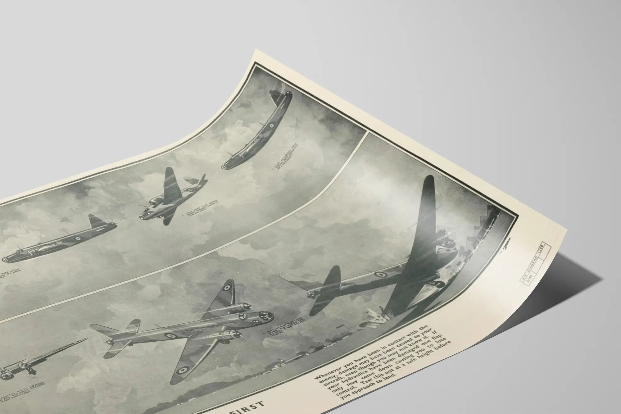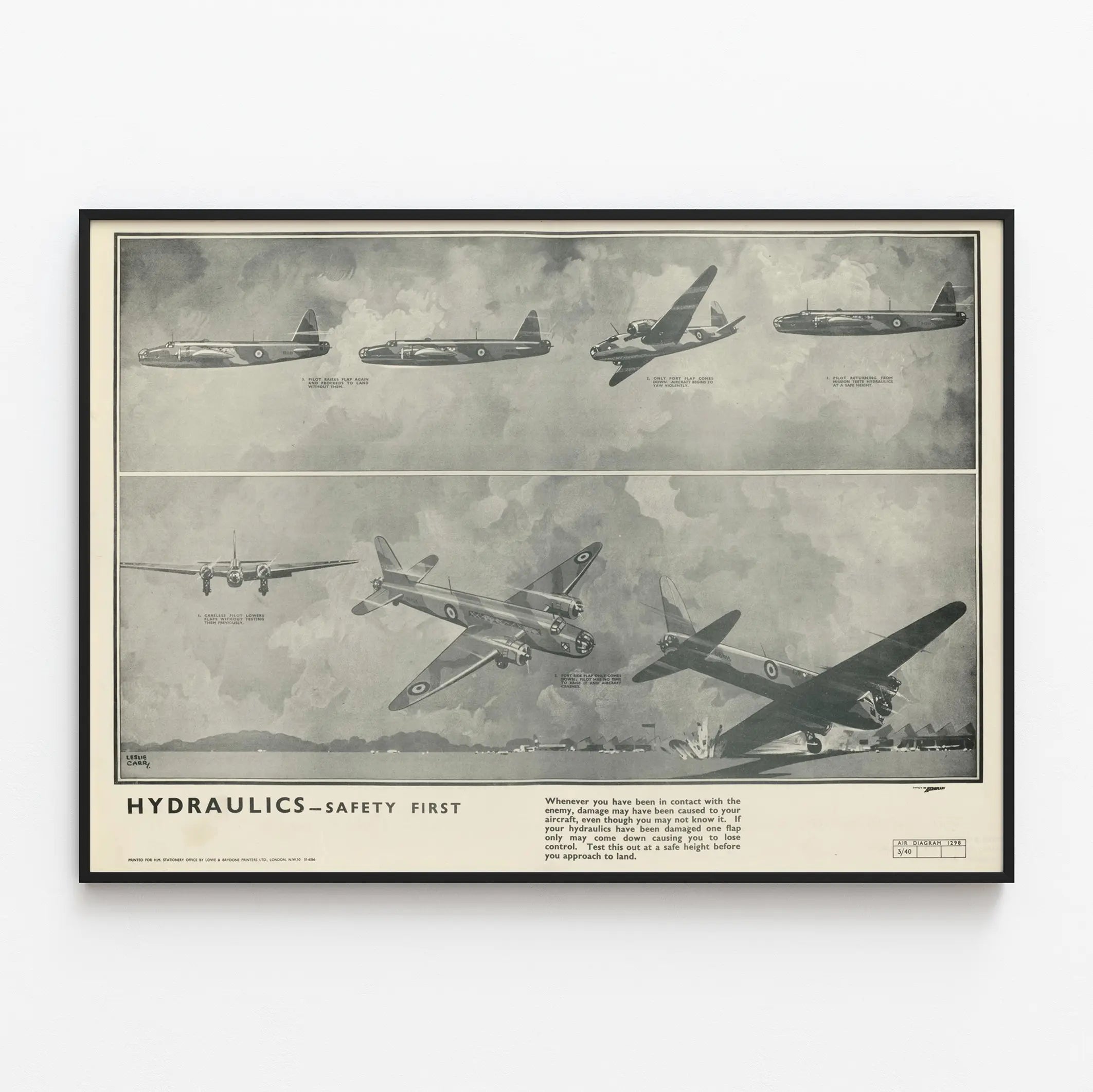 Dieses Vintage-Poster mit dem Titel „Hydraulik – Sicherheit an erster Stelle“ zeigt eine essenzielle technische Anleitung zur hydraulischen Sicherheit in der Luftfahrt. Dieses schwarz-weiße Plakat mit detailliertem künstlerischem Stil stellt mehrere Militärflugzeuge im Flug und bei spezifischen Manövern im Zusammenhang mit Hydrauliksystemen dar. Am oberen Rand präsentiert eine Reihe von Szenen die Wirkungen und die Steuerung der Hydraulikklappen, begleitet von Legenden, die die Folgen für die Stabilität des Flugzeugs bei beschädigten oder falsch bedienten Systemen erklären. In der Mitte und am unteren Rand zeigt das Plakat eine Sequenz, die die Risiken eines fehlerhaften hydraulischen Betriebs verdeutlicht, wobei ein Flugzeug die Kontrolle verliert und ein Absturz durch eine Fehlfunktion der Hydraulikklappe dargestellt wird. Der erklärende Text warnt vor unsichtbaren Schäden, die bei Einsätzen im Kampf entstehen können, und hebt die Bedeutung hervor, die hydraulische Funktion vor der Landung in sicherer Höhe zu testen. Dieses technische Poster ist ein dekoratives Wandstück, das Luftfahrtenthusiasten, Militärgeschichte und Retro-Design begeistert und Ihrem Interieur eine authentische und lehrreiche Note verleiht. Ideal als Wandposter in einem Büro oder einem Raum, der der Luftfahrtleidenschaft gewidmet ist, verbindet es Ästhetik mit pädagogischem Wert. Dieses vintage Wandbild spiegelt die Bedeutung von Sicherheit und Wartung im Luftfahrtkontext wider und verleiht jedem Raum einen alten, industriellen Charme. Eine perfekte Wahl, um eine Sammlung technischer Poster zu bereichern oder einen Raum mit einem starken Luftfahrtthema zu dekorieren.