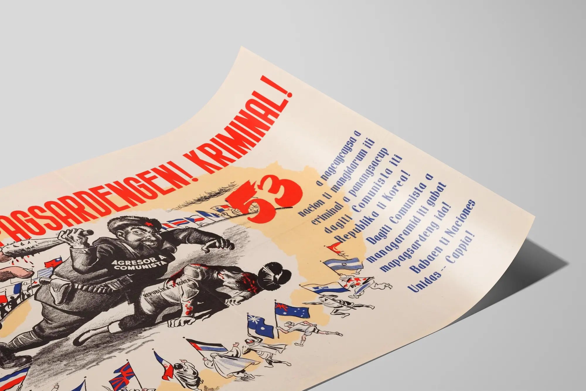 Dieses Vintage-Poster zeigt eine kraftvolle und engagierte Illustration, die in eine Wanddekoration im historischen und politischen Stil eingebunden ist. Es stellt eine dramatische Szene dar, in der eine karikaturhafte Figur in Uniform, als „kommunistischer Angreifer“ identifiziert, eine andere Person am Boden bedroht, die mit „Republika ti Korea“ beschriftet ist. Die Atmosphäre des Posters wird durch die Verwendung der Farben Rot und Schwarz verstärkt, Symbole für Dringlichkeit und Gefahr, kombiniert mit einem hellbeigen Hintergrund, der die Hauptbestandteile intensiv hervorhebt. Die Komposition hebt das Konzept der Warnung vor einer wahrgenommenen Gefahr hervor und lädt mit dem leuchtend roten Text „PAGSARDENGEN! KRIMINAL!“ zur Wachsamkeit ein. Um die Hauptszene herum entdeckt man einen dynamischen Kreis von Figuren, die verschiedene Nationen symbolisieren und durch ihre Flaggen erkennbar sind, was die Idee einer internationalen Koalition im Kampf gegen diese Bedrohung illustriert. Dieses Detail verleiht dem Werk eine kollektive Dimension und stärkt die Botschaft der Einheit für eine gemeinsame Sache. Dieses Poster lässt sich als ein Vintage-Politikplakat definieren, das seinen Platz in einer Wanddekoration im Retro- oder Aktivisten-Stil findet. Sein auffälliger grafischer Stil, geprägt durch eine Tuschezeichnung mit roten blutigen Akzenten, verleiht eine dramatische und expressive Note, die Liebhaber von Postern mit starker Botschaft begeistern wird. An einer Wand im Inneren verwandelt es diese in eine echte visuelle Aussage. Ideal für Liebhaber origineller Wandgestaltung, ermöglicht dieses Poster auch, einen Blickfang in einem Raum mit industriellem, vintage oder eklektischem Dekor zu schaffen. Es passt gut in Bereiche wie Büros, Wohnzimmer oder sogar kulturelle Orte, an denen Geschichte und grafische Kunst eine besondere Resonanz finden. Kurz gesagt, dieses Vintage-Poster „Stop kommunistischer Kriminalität“ ist sowohl ein Wanddekorationselement als auch ein grafisches, historisches Zeugnis. Sein einzigartiges Design und seine eindrucksvolle Botschaft machen es zu einer ästhetischen Wahl für alle, die Plakate mit politischem Inhalt und kraftvoller visueller Wirkung schätzen. Ein bemerkenswertes Ergänzungsstück für jede Sammlung von Zeitdrucken oder um einen Raum mit einem authentischen Vintage-Stil und einem Hauch Provokation zu bereichern.
