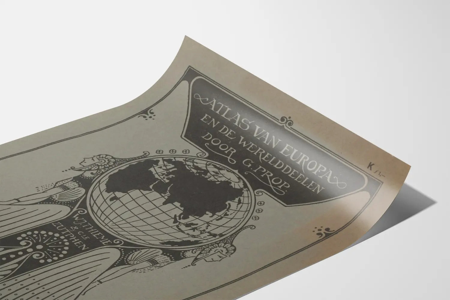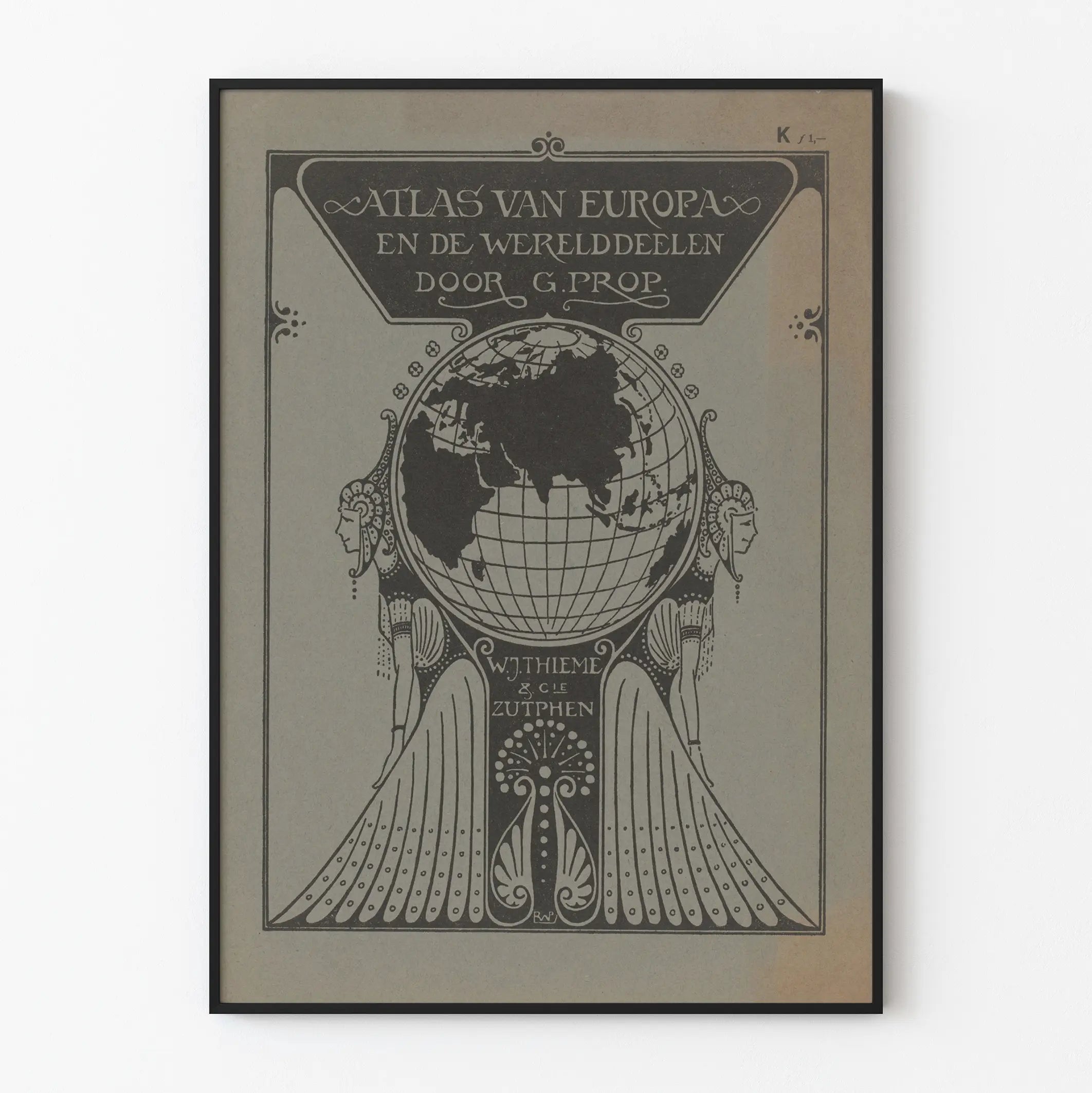 Dieses Vintage-Poster zeigt die Titelseite des Atlas Europas und der Kontinente, ein Werk von G. Prop, veröffentlicht von W.J. Thieme & Cie in Zutphen. Es ist ein einzigartiges Wanddekorationselement, ideal für Liebhaber von Kartografie und Geschichte. Das Design hebt eine stilisierte Weltkarte in Schwarz auf grauem Hintergrund hervor, eingerahmt von zwei weiblichen Figuren im Art-déco-Stil, die wahrscheinlich Stabilität und Weisheit symbolisieren und diesem Poster eine künstlerische und elegante Note verleihen. Der niederländische Text nennt klar den Titel des Atlas, was seine authentische und alte Erscheinung unterstreicht. Dieses Vintage-Poster kann als Dekorationsplakat in einem Büro, Wohnzimmer oder einer Bibliothek verwendet werden und schafft eine Atmosphäre, die sowohl kulturell als auch raffiniert ist. Seine Typografie und grafischen Ornamente betonen seinen künstlerischen und alten Charakter und fügen sich perfekt in eine klassische oder retro Dekorationswelt ein. Durch seine geografische Darstellung erinnert es auch an eine Reise durch die Kontinente und weckt Neugier sowie Bewunderung für die Welt aus einer historischen Perspektive. Ob Sie eine Wanddekoration für einen europäischen Raum oder für ein thematisches Interieur über Geografie und Reisen suchen, dieses Atlas-Poster von G. Prop ist eine markante Wahl. Es richtet sich an Liebhaber grafischer Kunst und Sammler antiker kartografischer Objekte. Die Qualität der Grafik und die visuelle Gestaltung dieses Posters machen es zu einem zugänglichen und einzigartigen Wanddekorationselement, das jede Wand mit einem kulturellen und ästhetischen Akzent aufwerten kann. Zusammenfassend stellt dieses Atlas-Poster Europas und der Kontinente eine perfekte Verbindung zwischen grafischer Kunst, Kartografie und Wanddekoration dar. Es vereint Eleganz, Geschichte und Modernität in einem schlichten und zeitlosen Stil.