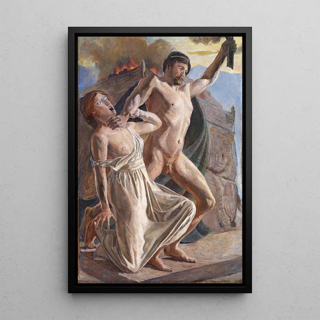 In "Prométhée stiehlt das Feuer" fängt Poul Simon Christiansen einen dramatischen Moment der griechischen Mythologie ein, in dem der Titan Prométhée, Symbol für Rebellion und Großzügigkeit, das Feuer der Götter stiehlt, um es der Menschheit zu schenken. Die Szene wird mit einer spürbaren emotionalen Intensität dargestellt, wobei die lebendigen Farben und die auffälligen Kontraste den Kampf zwischen Schatten und Licht hervorrufen. Die Technik von Christiansen, die Realismus und Romantik verbindet, verstärkt die Dynamik dieser mutigen Geste und schafft eine Atmosphäre, die sowohl heroisch als auch tragisch ist.
