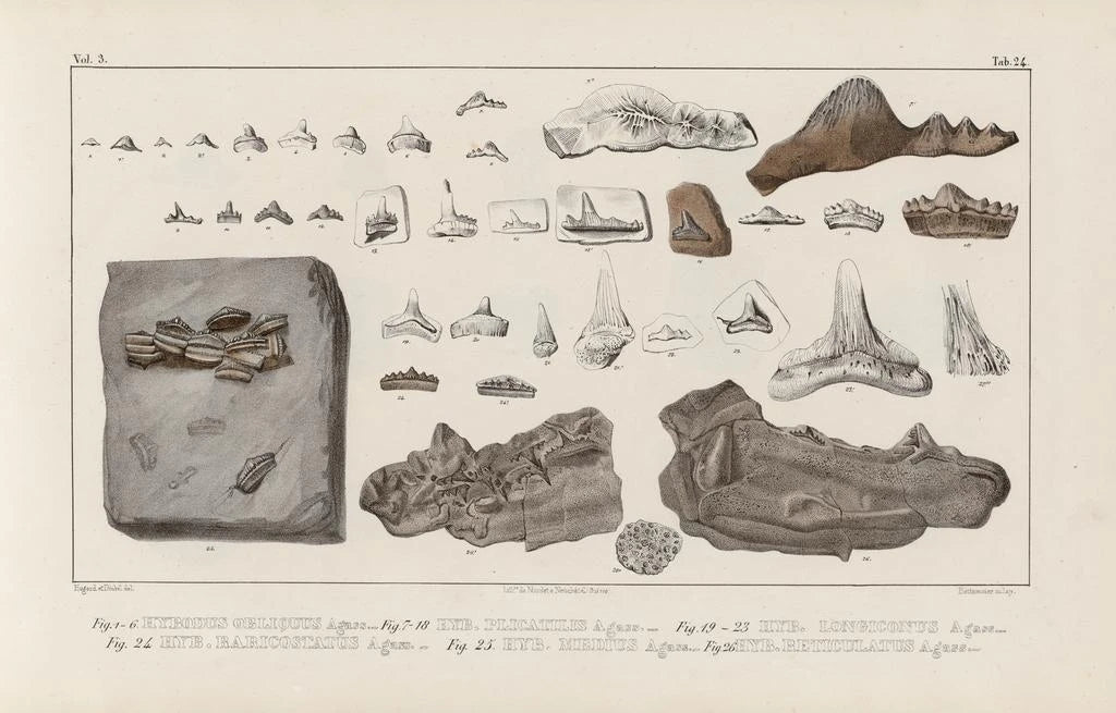 Die Reproduktion des Kunstwerks Forschungen an fossilen Fischen, Pl. 303 entführt uns in eine faszinierende Wasserwelt. Die akribischen Details der Fossilien, mit wissenschaftlicher Präzision wiedergegeben, offenbaren eine Palette erdiger Farben und zarte Nuancen, die die Schönheit der verschwundenen Meereskreaturen widerspiegeln. Die von Louis Agassiz verwendete Gravurtechnik betont ein harmonisches Gleichgewicht zwischen Kunst und Wissenschaft und schafft eine sowohl kontemplative als auch lehrreiche Atmosphäre. Jedes Element dieses Kunstwerks lädt den Betrachter ein, die Geheimnisse der Evolution zu erforschen und die Vielfalt vergangener Biodiversität zu schätzen.